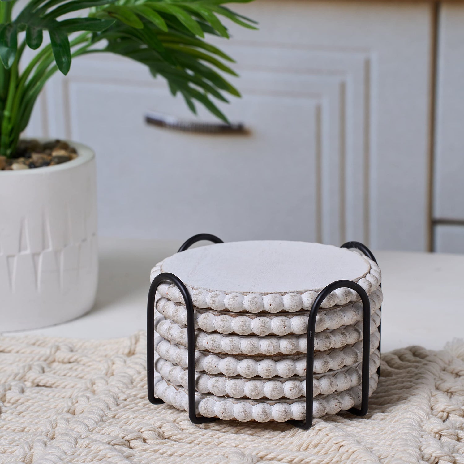 - ✅HOUSE WARMIN GITFS: The wood bead coasters for drinks absorbent set with an elaborate black metal holder. This lovely and innovative coasters can be given to your family and friends for birthday, holiday, Christmas, and Valentine's Day gift. Also Great for home, kitchen, living room, bar, hotel, party and restaurants. The drink coasters can be used on the wooden table and marble stone table, farmhouse or modern home decor.