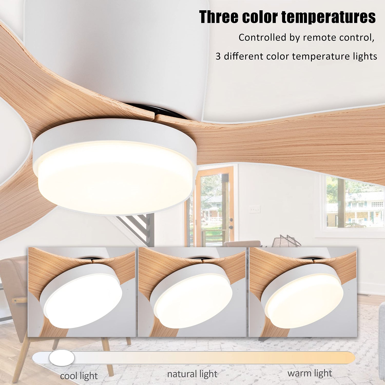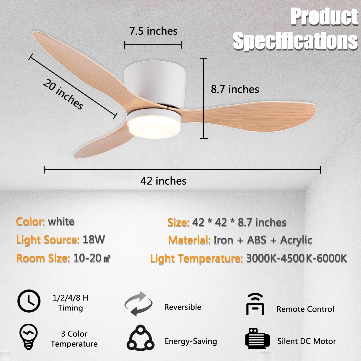 GESUM Ceiling Fan with Light, 42" Flush Mount Ceiling Fan Light with 3 Colors, 6 Speeds, Timing,Low Profile Ceiling Fan with Remote Control 3 Blades for Bedroom Dining Room (White Wood)