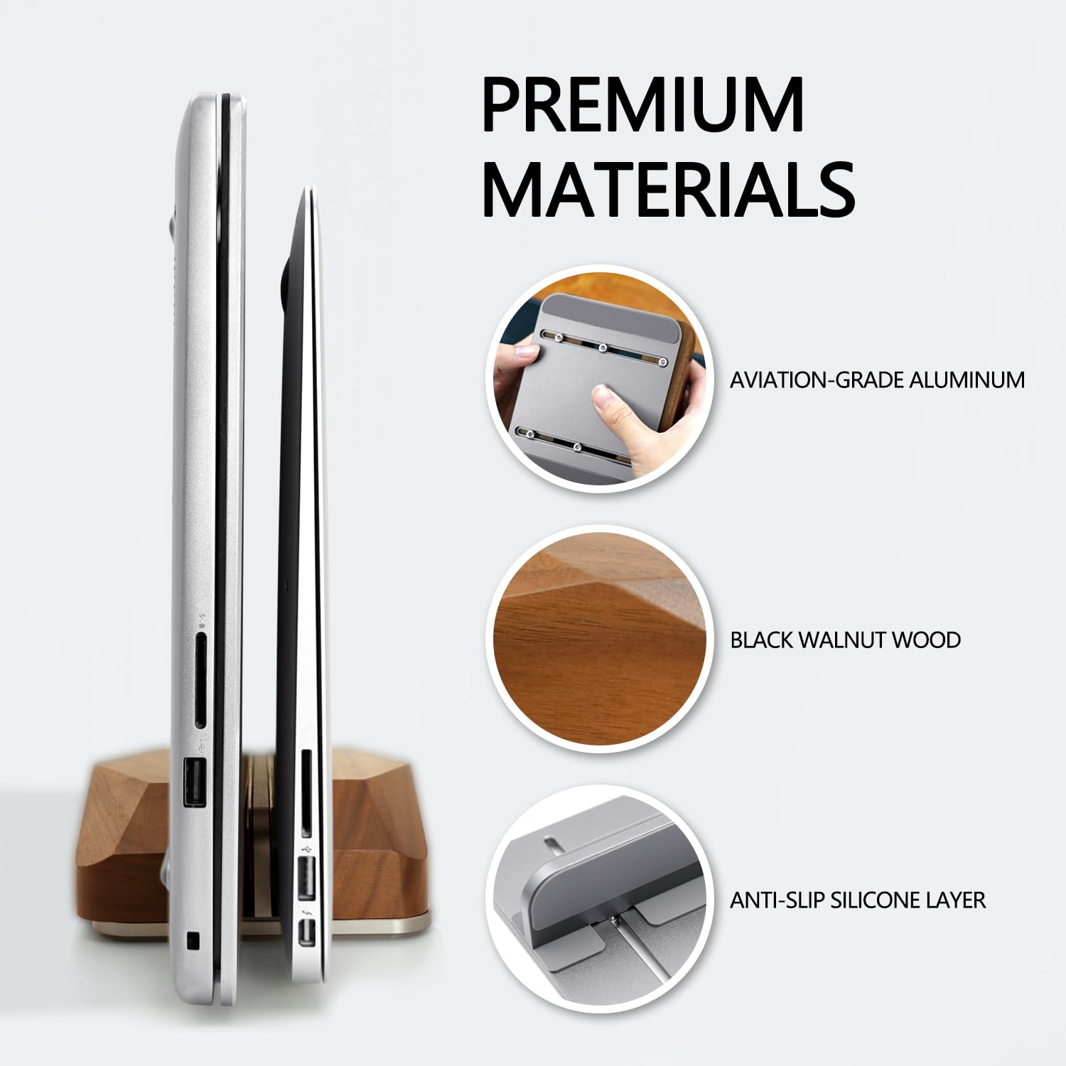 GEVO Dual Laptop Holder Vertical Laptop Stand, Natural Wood, Adjustable Dock, Wooden Laptop Stand,Vertical Laptop Holder for Desk, Widen Dock Fits All MacBook/Surface pro 2 Devices (Black Walnut)