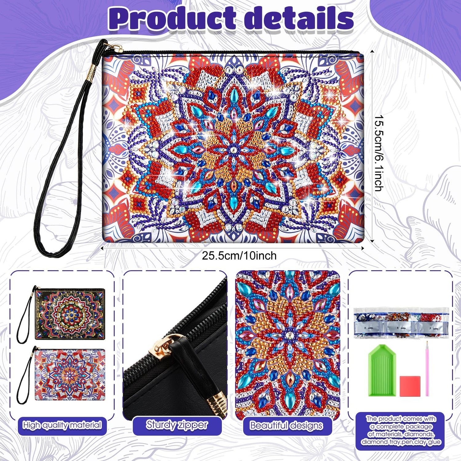- Mandala Painting Kit: the package contains 2 pieces of diamond painting handmade purses in 2 different styles, 1 piece of glue, 1 piece of pen, 1 piece of diamond tray and enough diamonds, complete and sufficient to satisfy your crafting and sharing demands