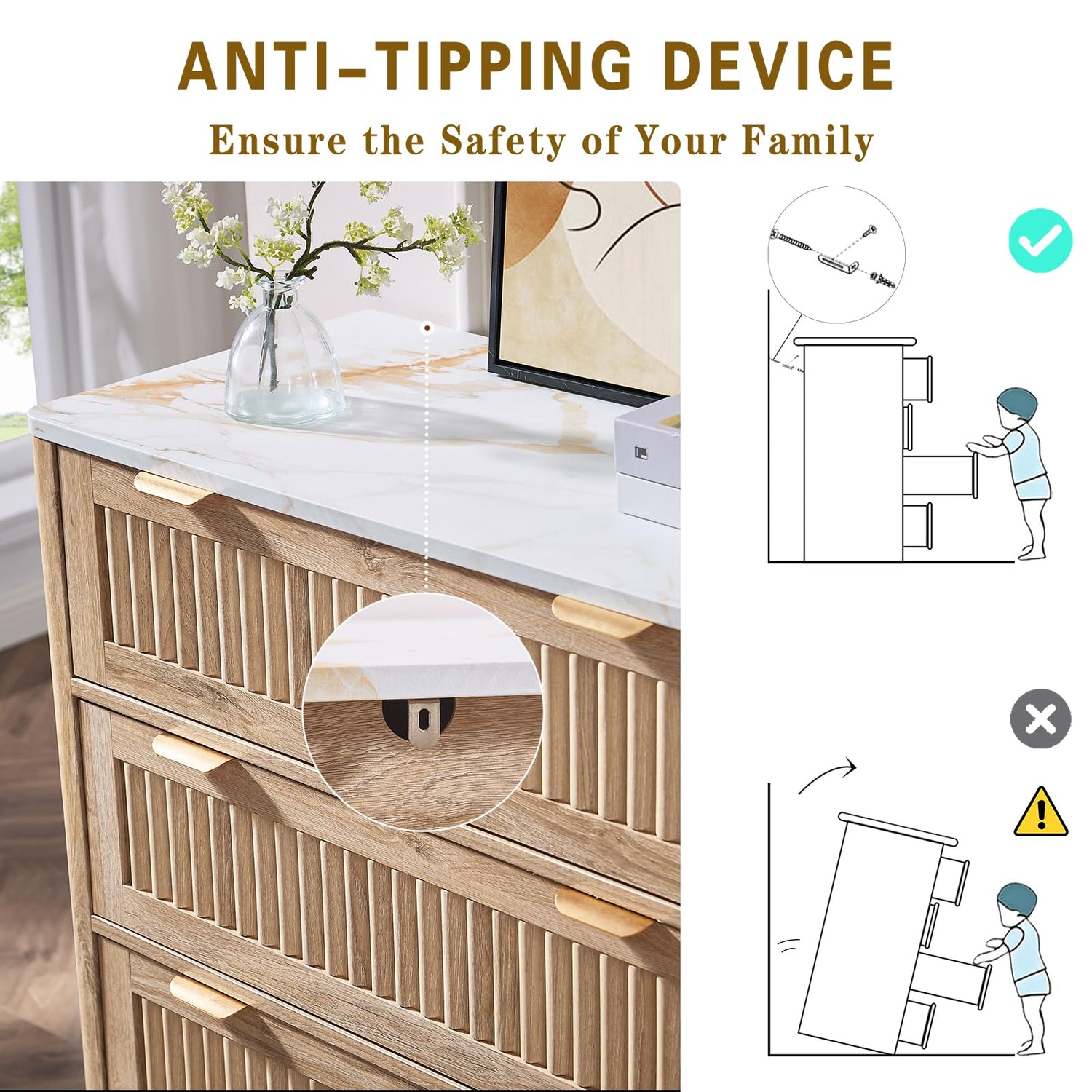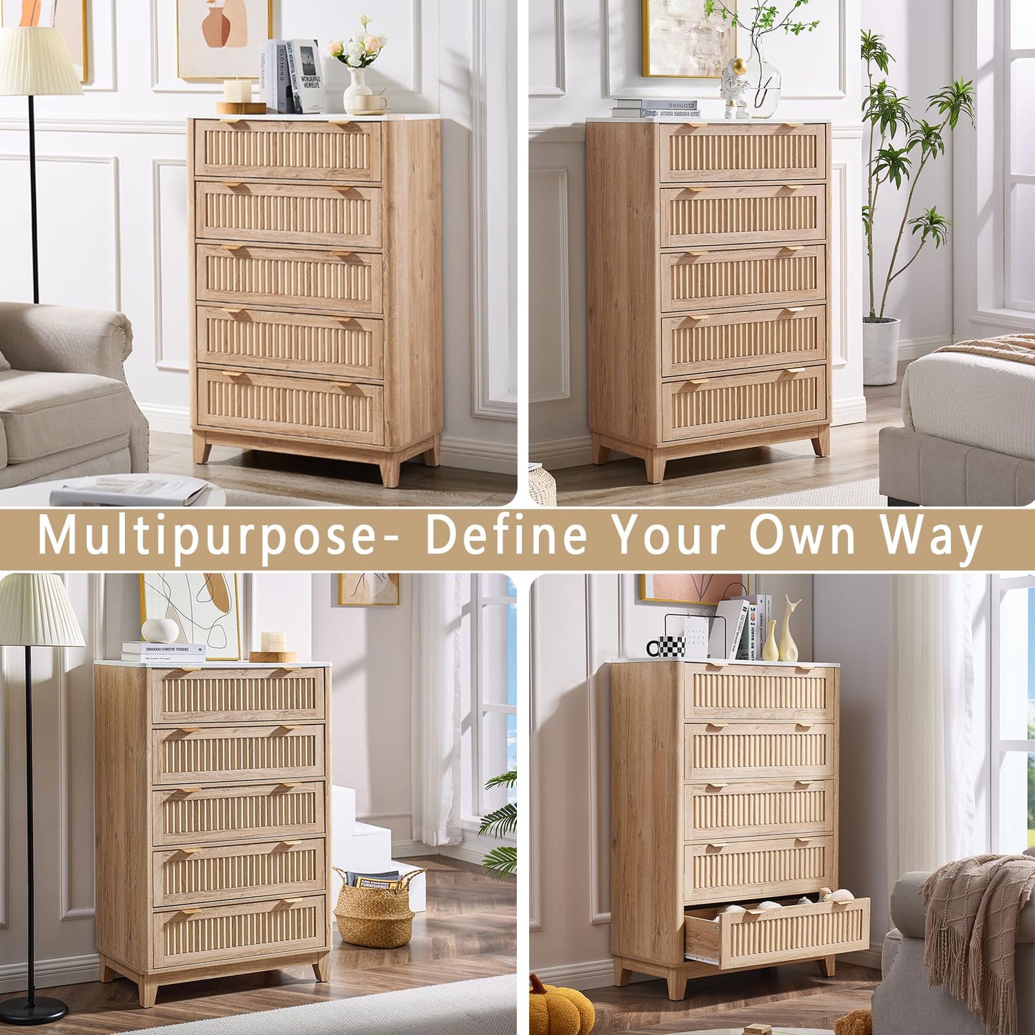 GIAJORYA Fluted Tall Dresser for Bedroom, 5 Drawer Dressers with Faux Marble Top, Wooden Chest of Drawers, Modern Storage Cabinet Organizer, Natural Oak
