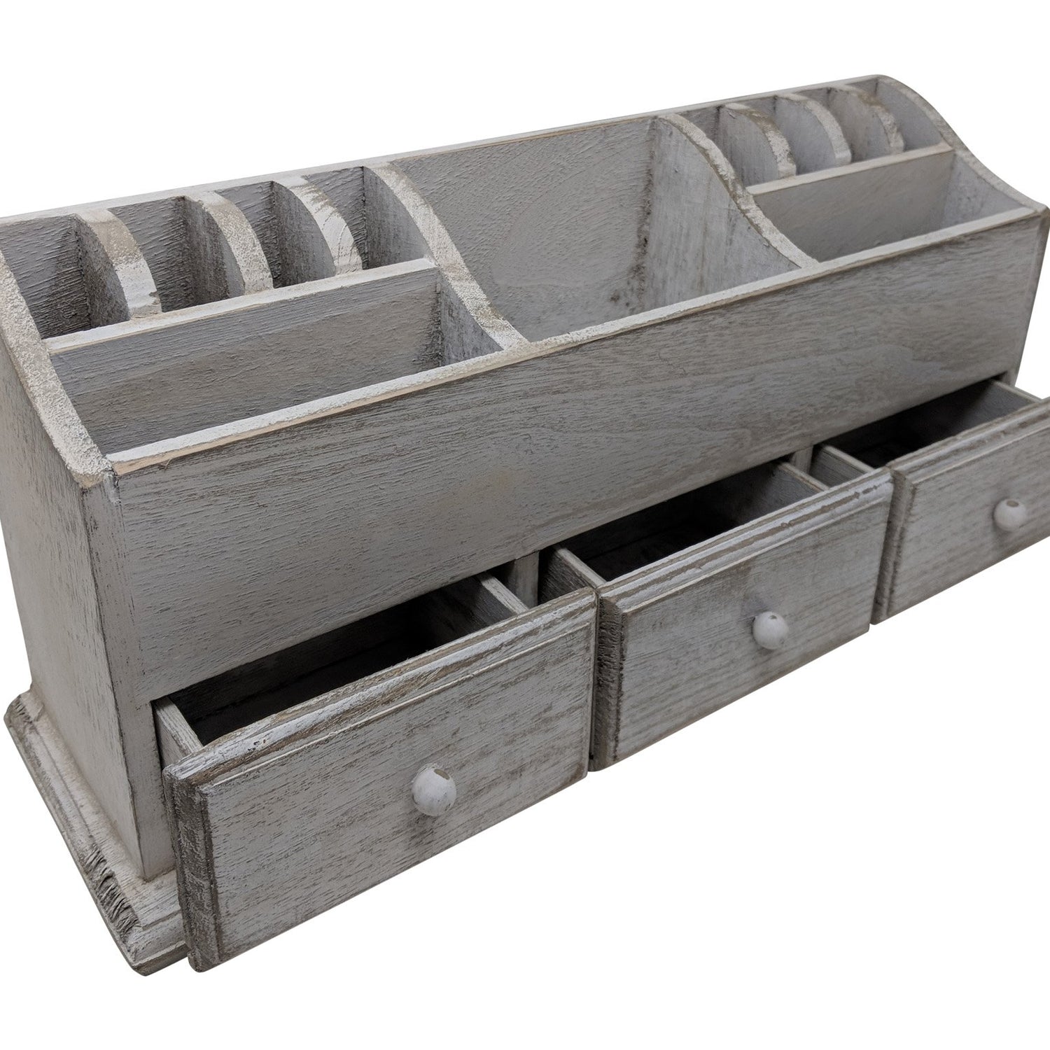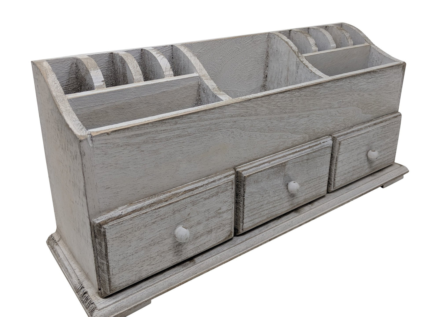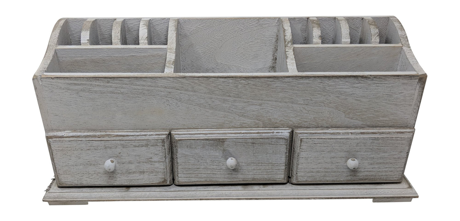 Details: Accent your shabby chic decor with our 3 drawer vanity organizer! . It has individual cubbies that can be used to store jewelry, cosmetics and much more on your dresser or vanity. Can also be used as a handy desk organizer for office supplies, pens and notepads and more. Features a rustic distressed gray/white finish that will go perfectly with your rustic style in your bedroom or office. 15-7/8"W x 7-3/8"D x 4-3/4"H.