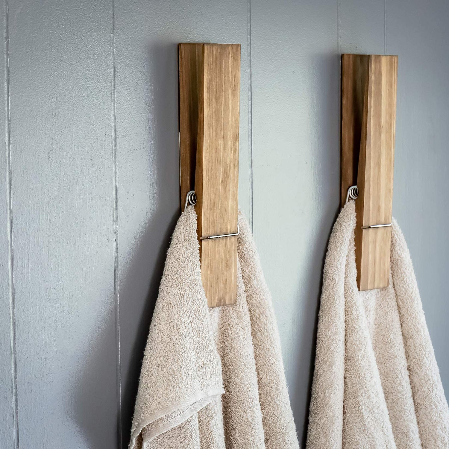 - STYLISH AND FUNCTIONAL: Our original bath towel hook fits many popular interior design as boho décor, farmhouse décor, and rustic décor making it a timeless piece. The wooden clips have all sorts of uses. They can be a bath towel holder, a kitchen towel holder, or cutely for kids drawings. Use to hold table numbers at weddings. The list is endless. Our giant clothespins always get compliments!