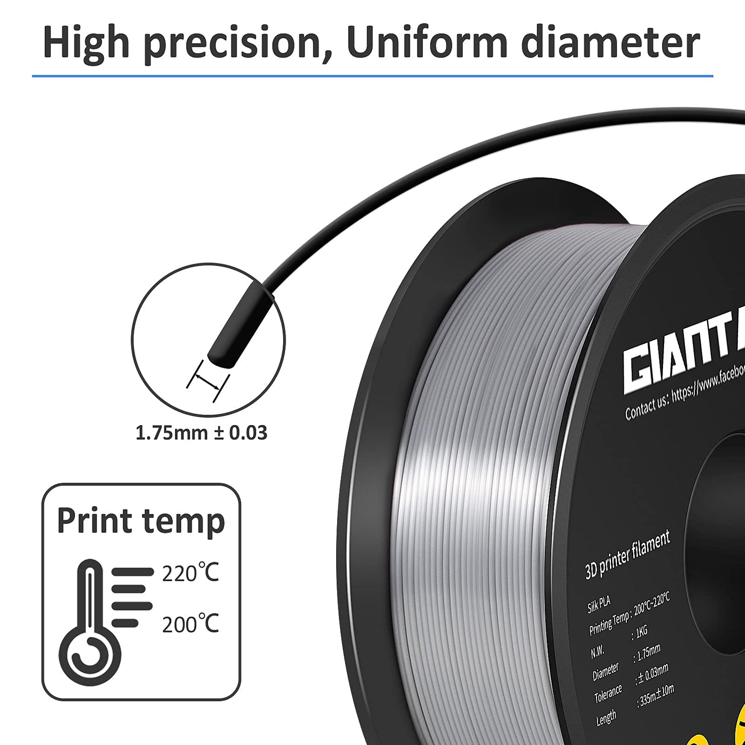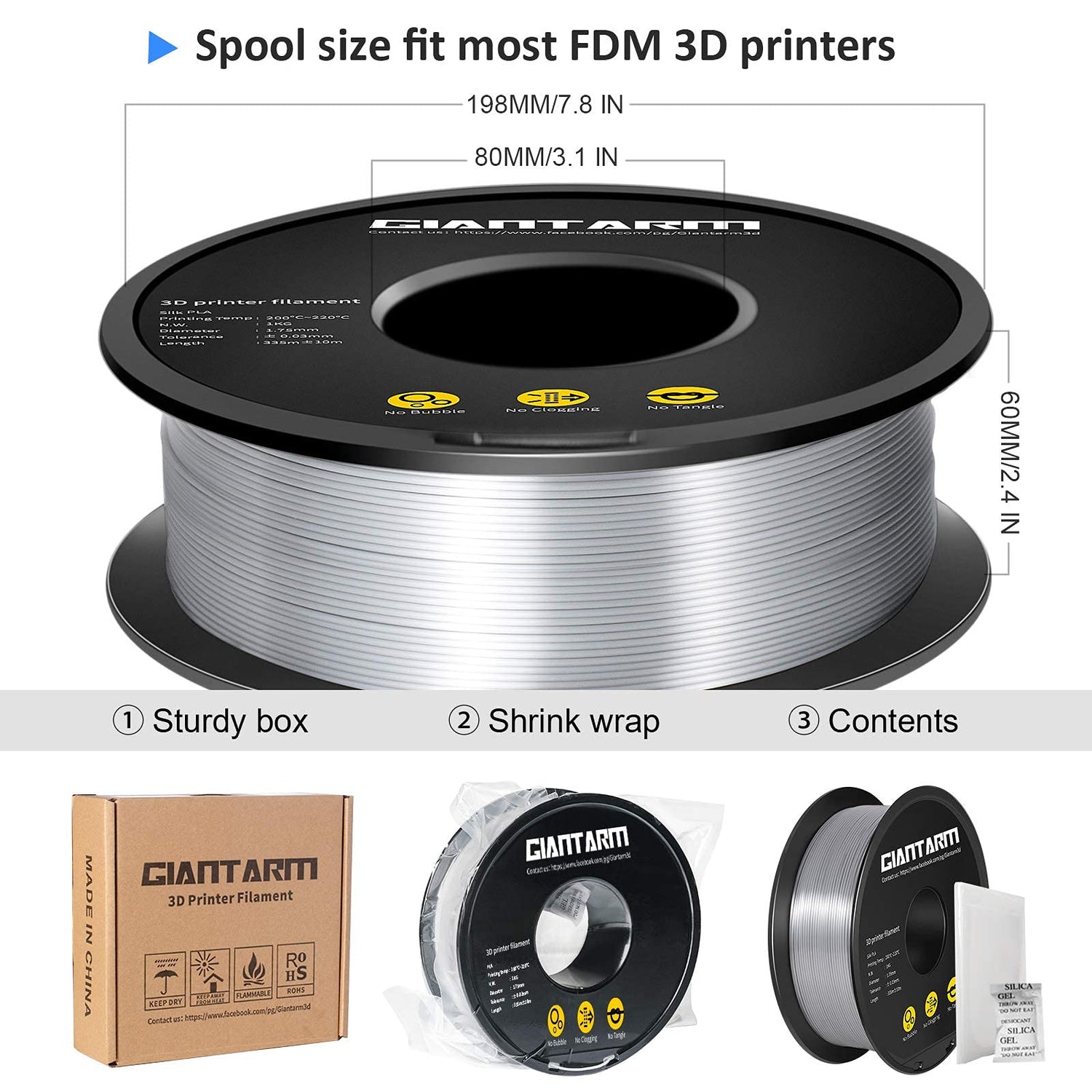 GIANTARM Silk Metallic Silver PLA 3D Printer Filament 1kg Spool, 1.75mm Dimensional Accuracy +/-0.03mm, 1080 Feet per Roll, Vacuum Packaging