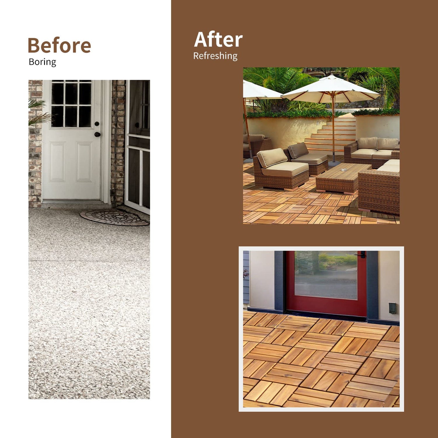 - 【Easy Maintain】: With proper maintenance, you can successfully extend the life span of those decking tiles. It is recommended to oil the flooring every 2 or 3 months if placed outside. And you can easily cut the tiles to fit any space you need.