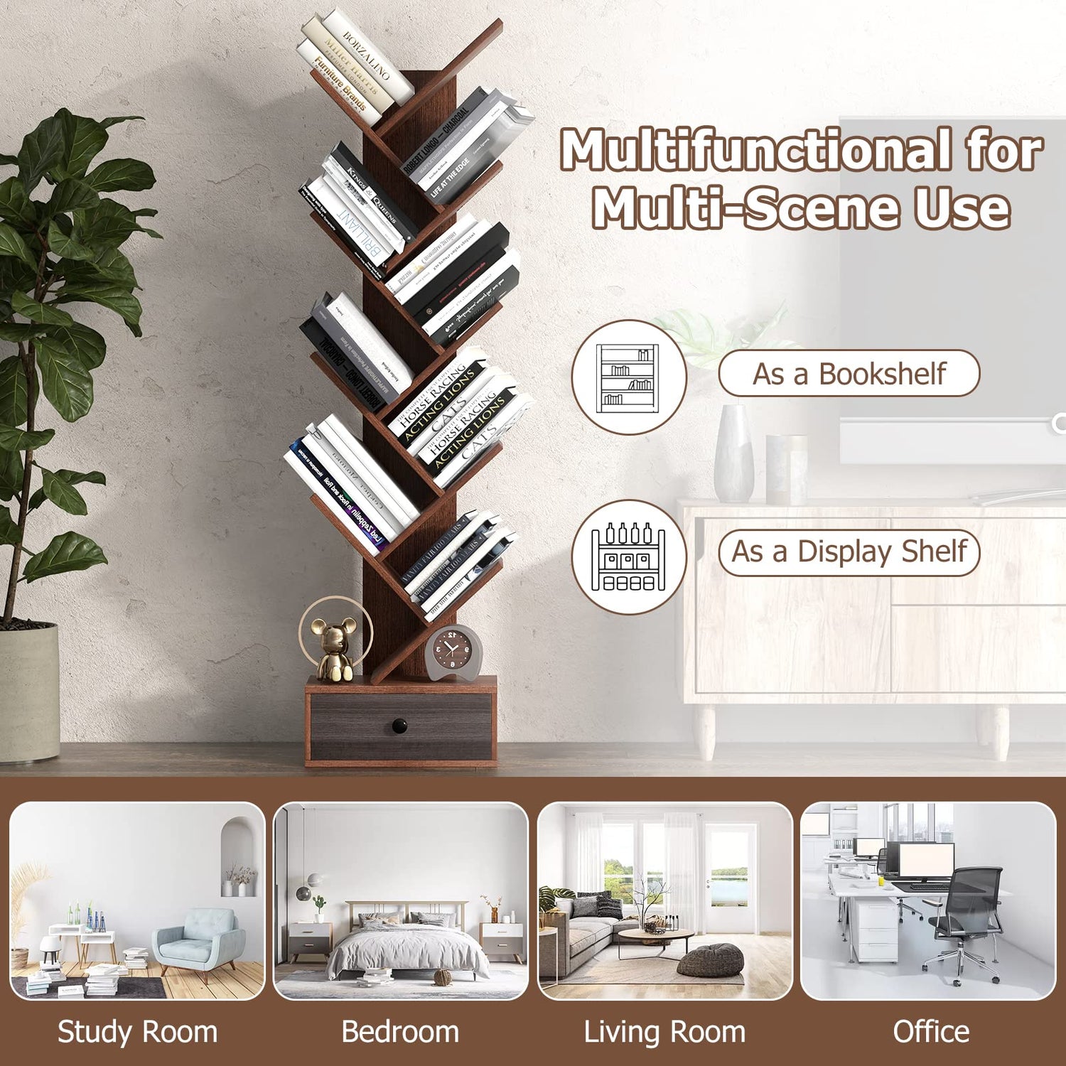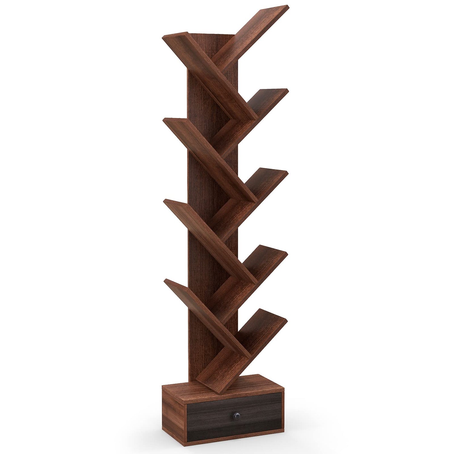 - [ 10-Tier Bookshelf with Drawer ]: Giantex tree bookcase is designed with 10 wide shelves in total, you can stack books based on different classification rules on each shelf. More, there is a pull-out wooden drawer at the bottom, allowing you to gain privacy for keys.