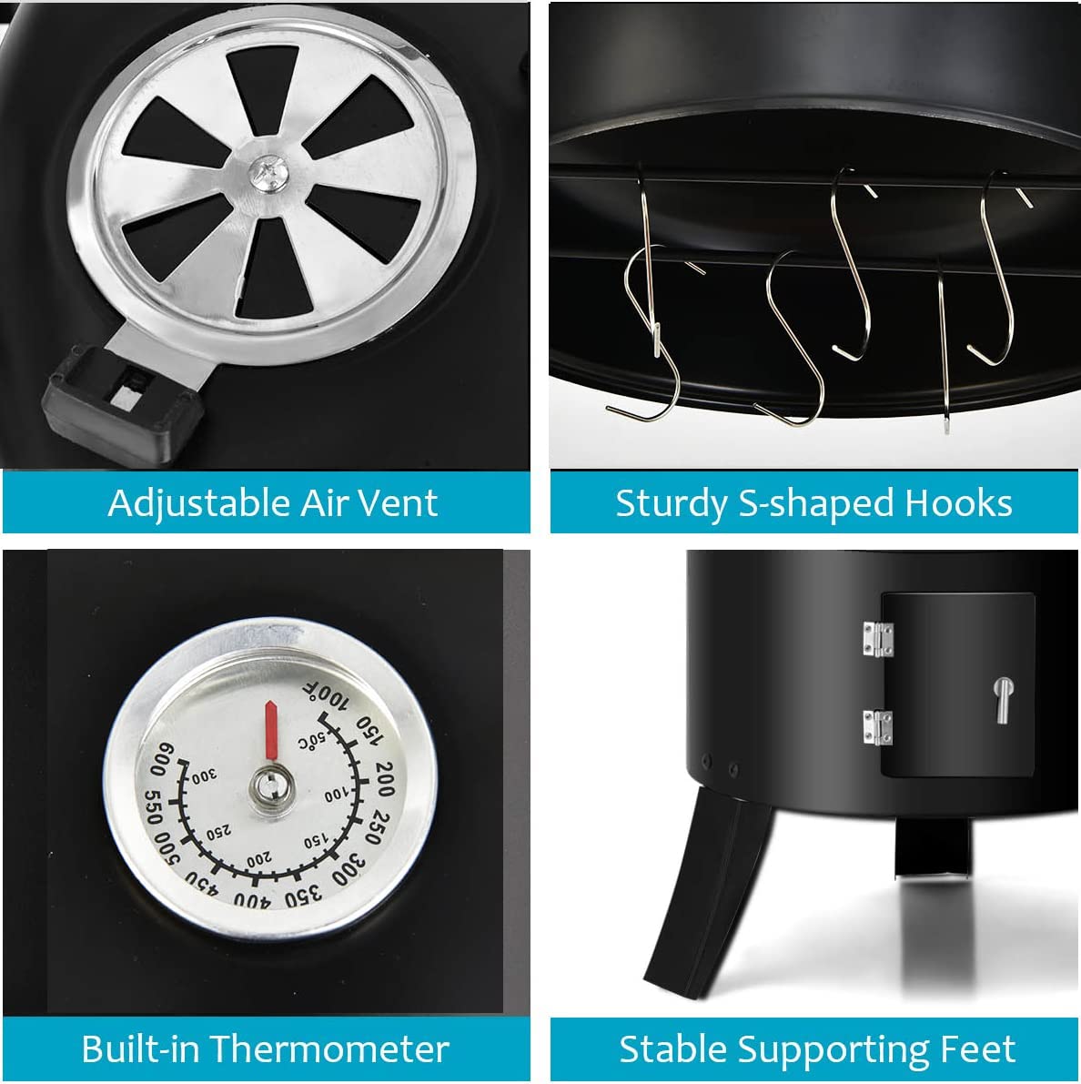 - 【Thoughtful Design】: This BBQ smoker grill is equipped with 2 access doors to check the condition of the food and add charcoal in time. And the furnace body is treated with high temperature paint, which has good heat resistance. In addition, the raised feet with triangular structure can effectively enhance its stability.