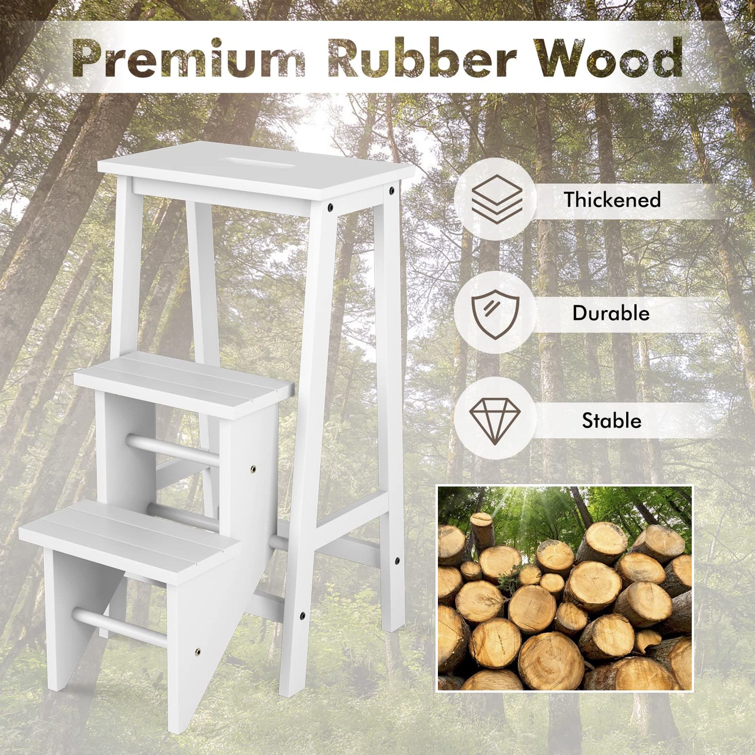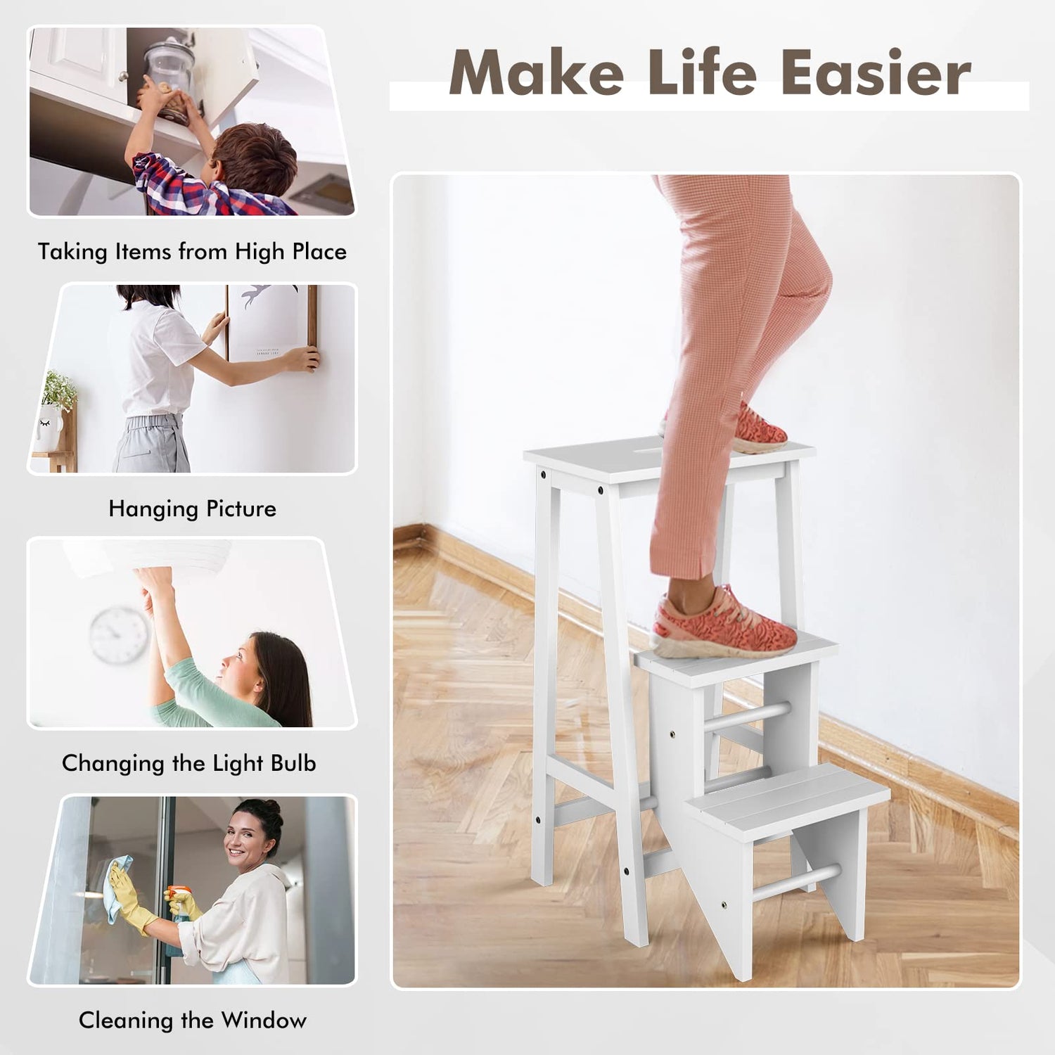 Giantex 3 Tier Folding Step Ladder, Multifunction 3-in-1 Wood Step Stool, Display Ladder and Storage Shelf for Library, Home Kitchen, Household Work, White
