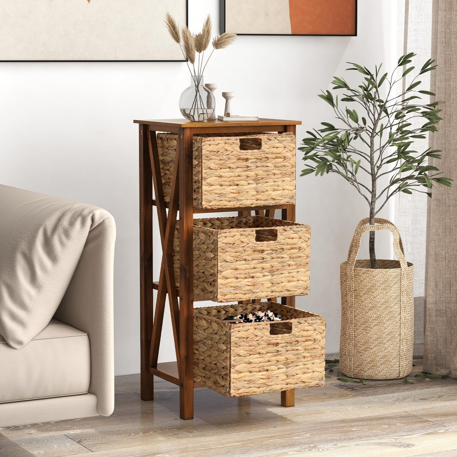 Giantex 3-Tier Nightstand with 3 Wicker Baskets, Wooden X-Design Side Table End Table, Beside Table with Acacia Wood Legs, Mid Century Accent Storage Cabinet for Small Spaces, Bedroom, Walnut