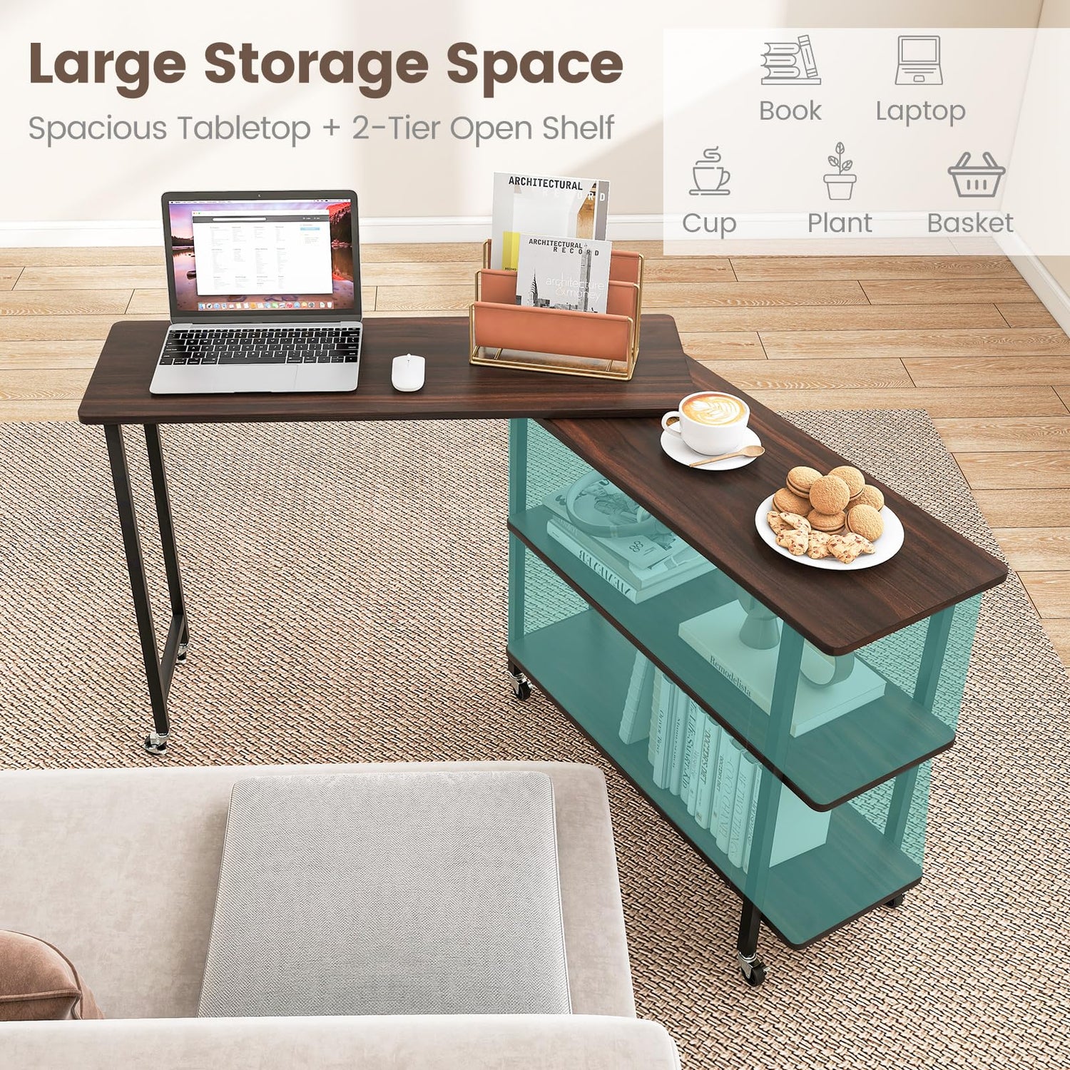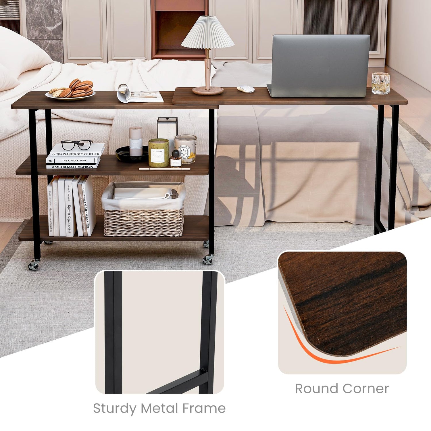 Giantex 360° Free Rotating Sofa Side Table, Mobile L-Shaped Laptop Desk with Sturdy Metal Frame, 6 Universal Casters, Movable Couch Snack Table with 2-Tier Storage Shelf for Home (Walnut)