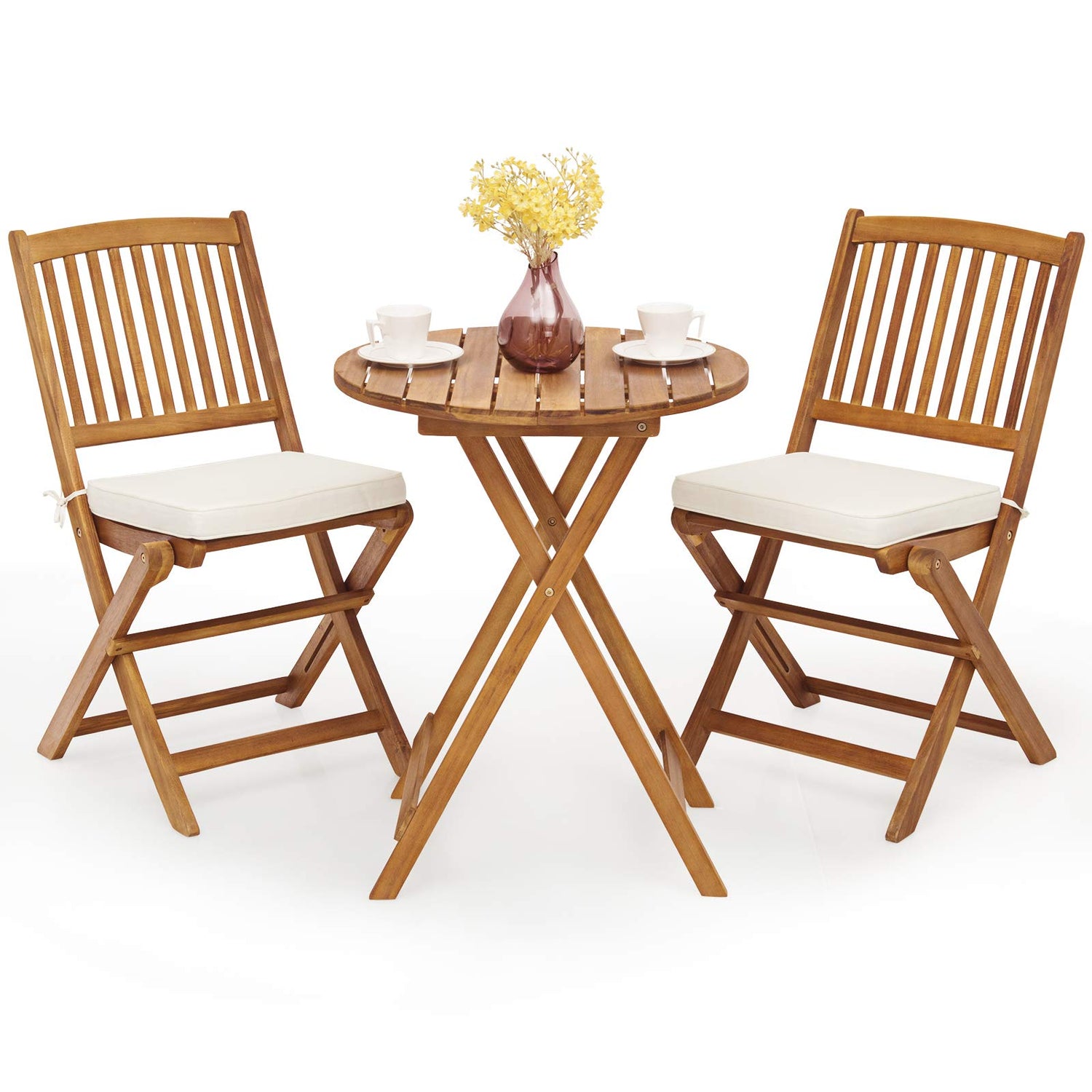 Giantex 3Pcs Patio Bistro Set, Wood Folding Table Set, 2 Cushioned Chairs for Garden Yard, Outdoor Furniture Round Table (Natural & Beige)