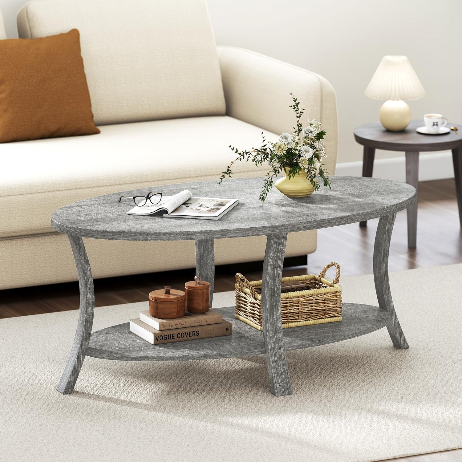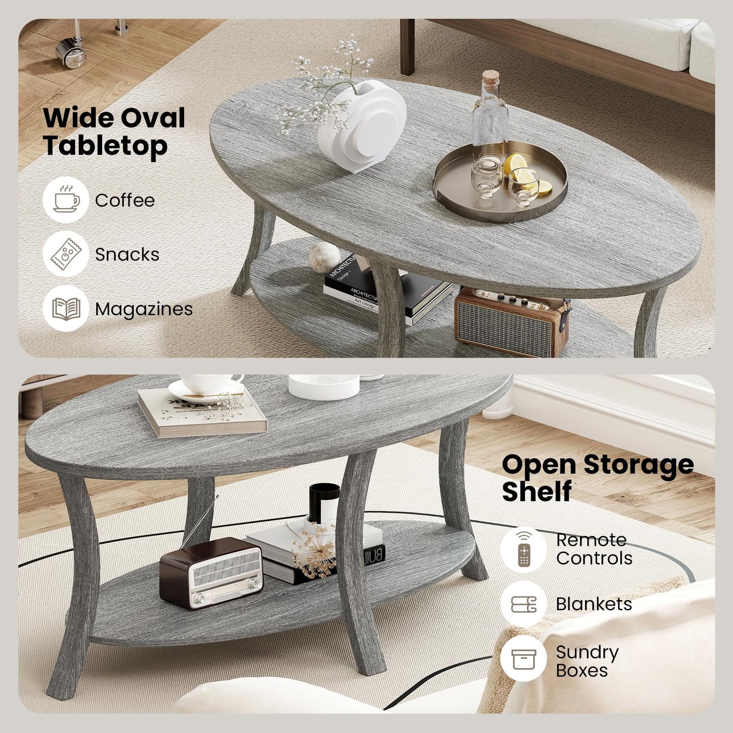 Giantex 44 Inch Oval Coffee Table, 2-Tier Center Table with Storage Shelf & Rubber Wood Frame, Modern Farmhouse Living Room Table for Reception Office, Gray