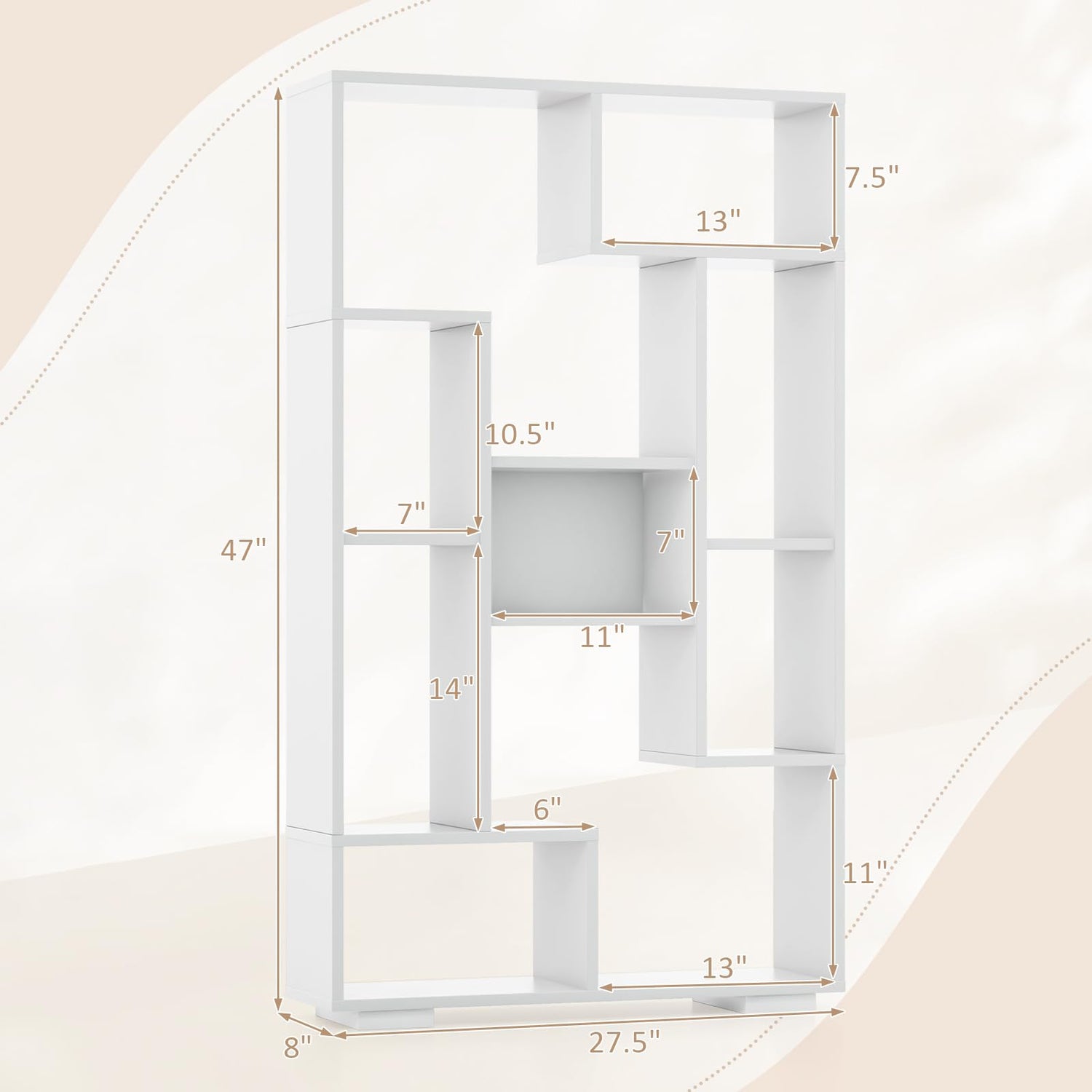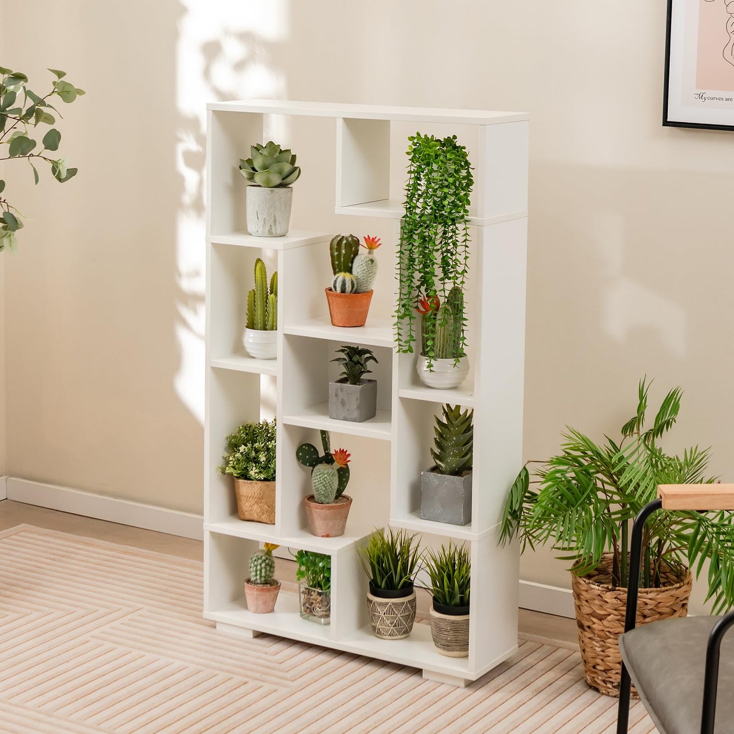 Get organized and elevate your space with our stylish and sturdy bookshelf! With a sturdy construction, this freestanding beauty is perfect for any room. Safety is a priority with 2 anti-tipping kits to securely anchor it to a wall. Its chic geometric design brings a modern flair to your living room, bedroom, or office. With altogether 11 open shelves, it provides abundant storage for books, ornaments, photos or plants, ensuring a clutter-free space. Assembly is a breeze with our easy-to-follow instructions. You can also use it as a room divider or a trendy plant stand. Don’t compromise on style or function - grab this versatile bookshelf today and transform your space!