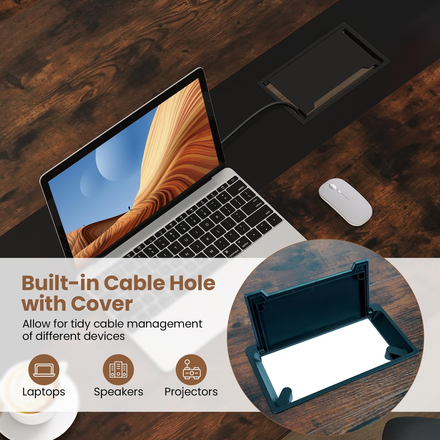 Built-in cable hole with cover organizes cables of laptops, speakers and projectors