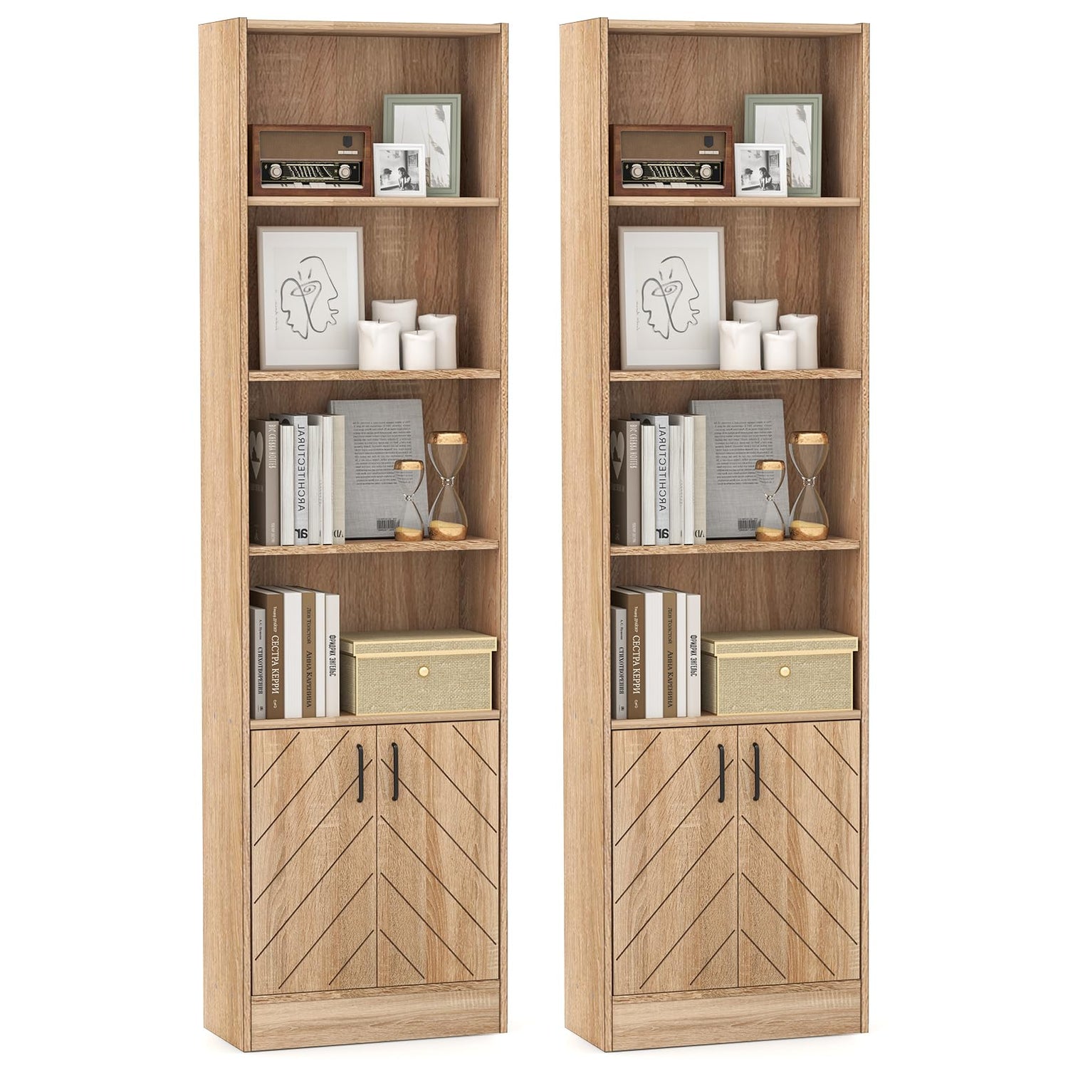 Giantex 6-Tier Bookshelf with Doors Set of 2, 71" Tall Bookcase w/ 4 Open Cubes & 3 Adjustable Shelves, Mid Century Display Cabinet, Modern Floor Storage Organizer for Living Room, Study, Oak