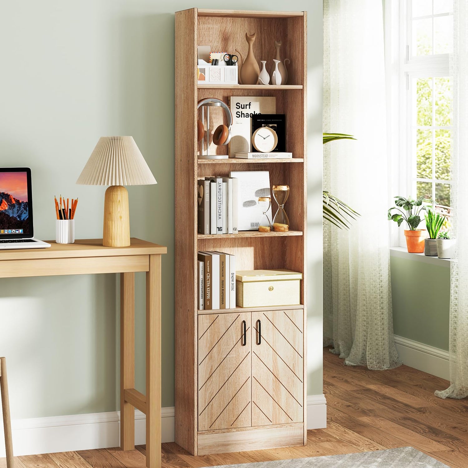 - [Timeless Mid-Century Modern Design]: This bookshelf features a stunning vertical strip pattern and a rich oak wood grain finish, adding a touch of sophistication and warmth to any space. Its mid-century modern design effortlessly blends with various home decor styles.