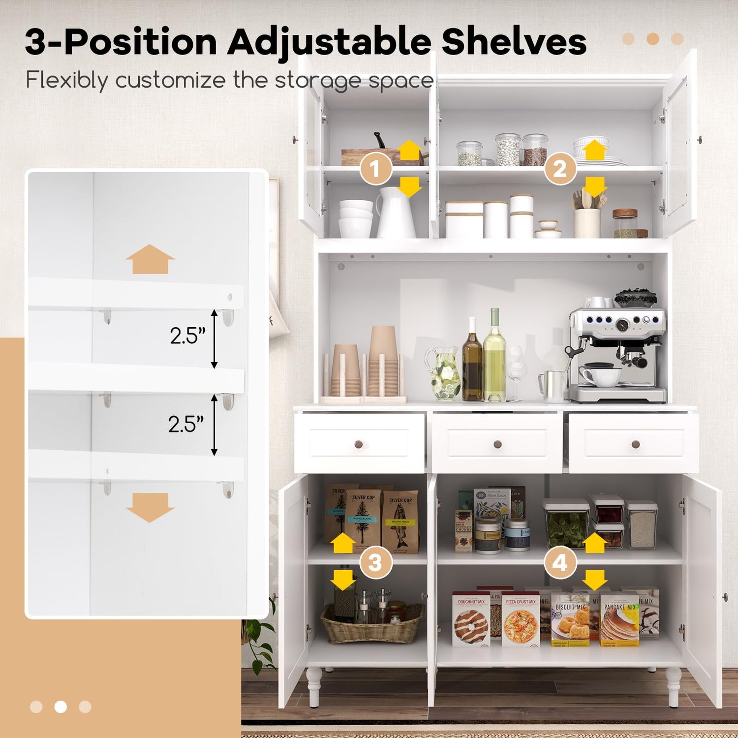 - [Flexible Storage Options]: Customize the storage space according to your needs with our kitchen cabinet, which features 3 drawers and 4 door cupboards. Each of the 4 shelves can be adjusted among 3 positions with a 2.5” increment, providing tailored storage space for items of varying sizes.