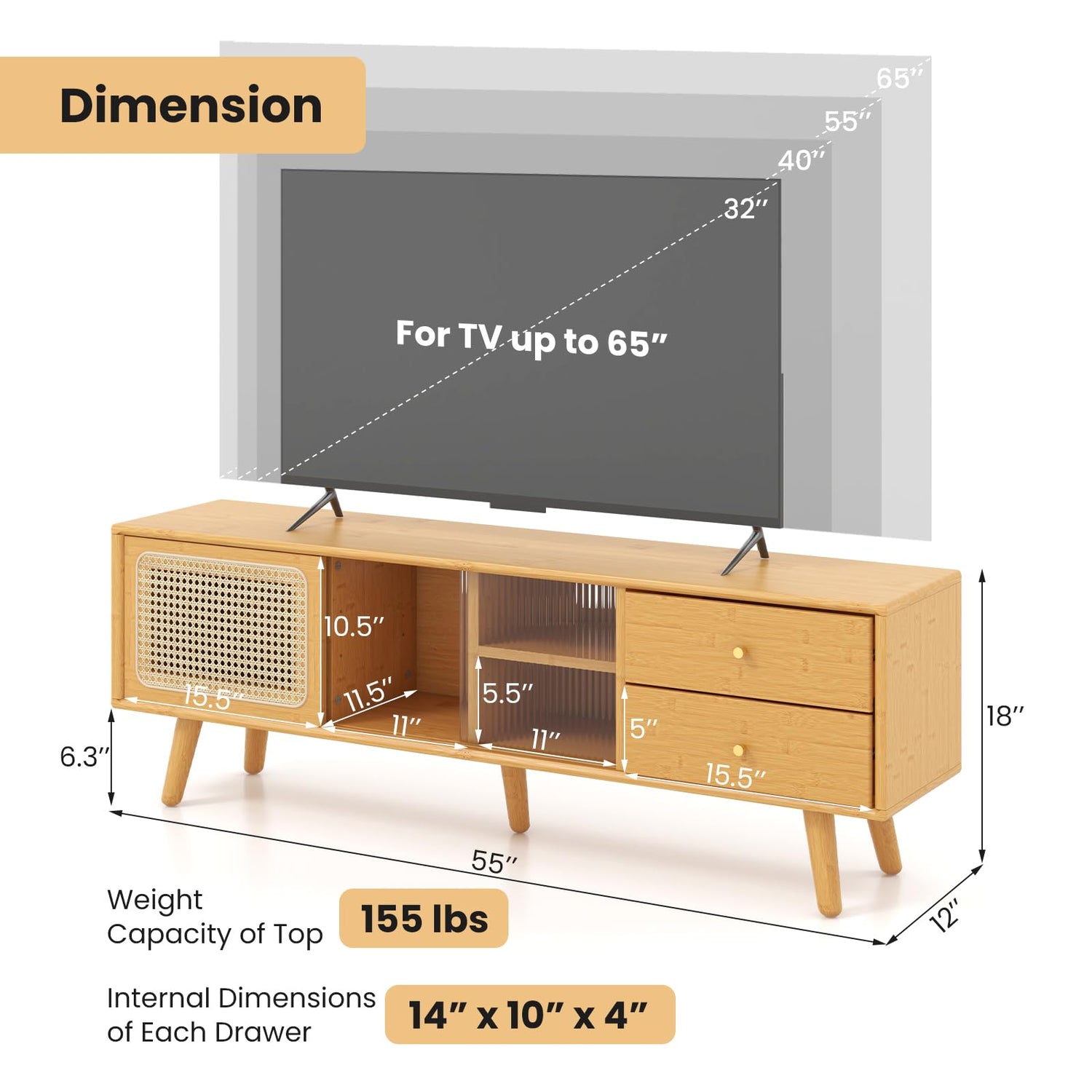 Giantex Bamboo TV Stand for 55 60 65 Inch TV, PE Rattan Entertainment Center with Sliding Doors, Drawers, Open Shelves, 5 Solid Wood Legs, 2 Cable Holes, TV Console Table for Living Room, Bedroom