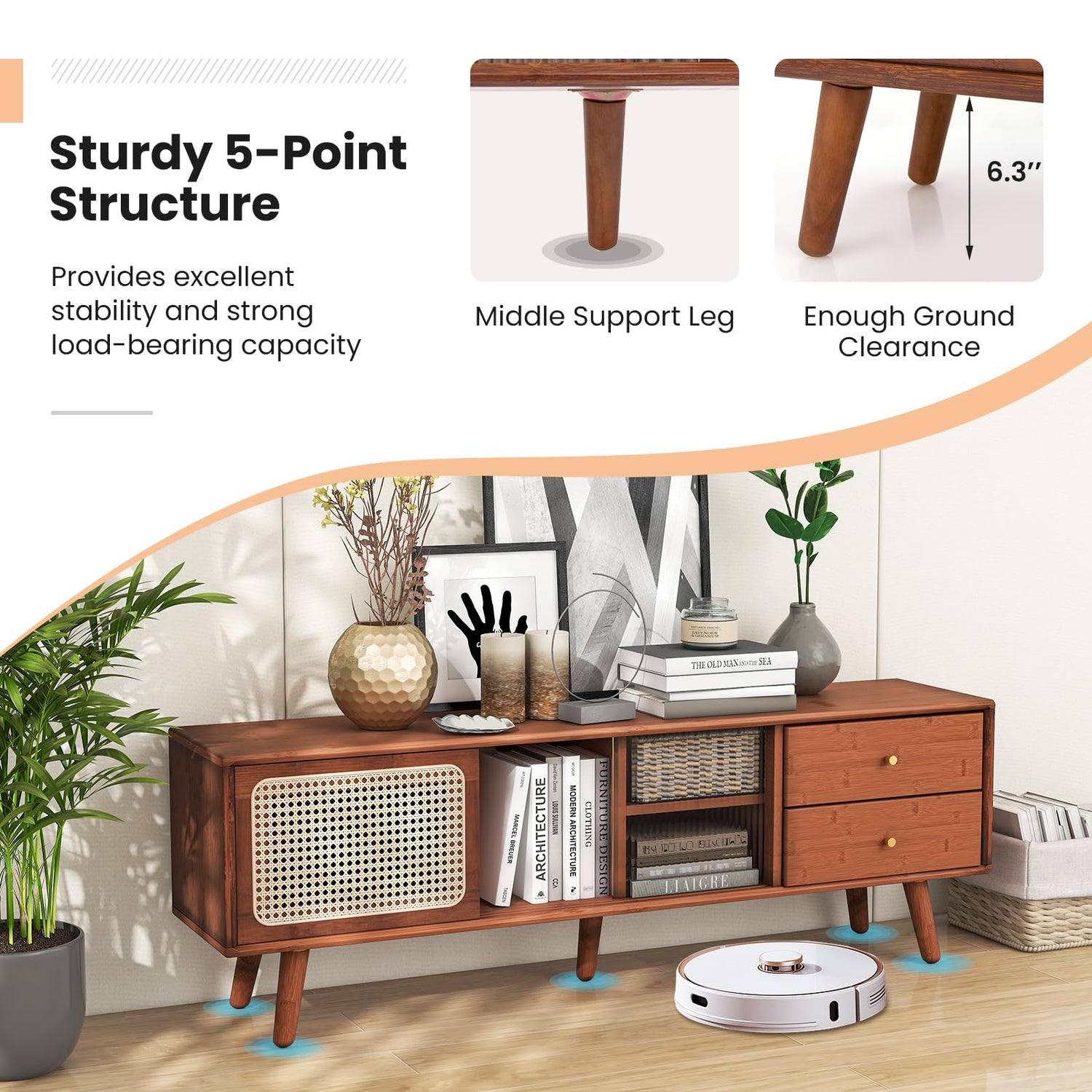 Giantex Bamboo TV Stand for TVs up to 65”, PE Rattan Media Console with Sliding Doors, Drawers & Open Shelves, 5 Solid Wood Legs, 2 Cable Holes, Entertainment Center for Living Room, Bedroom, Walnut