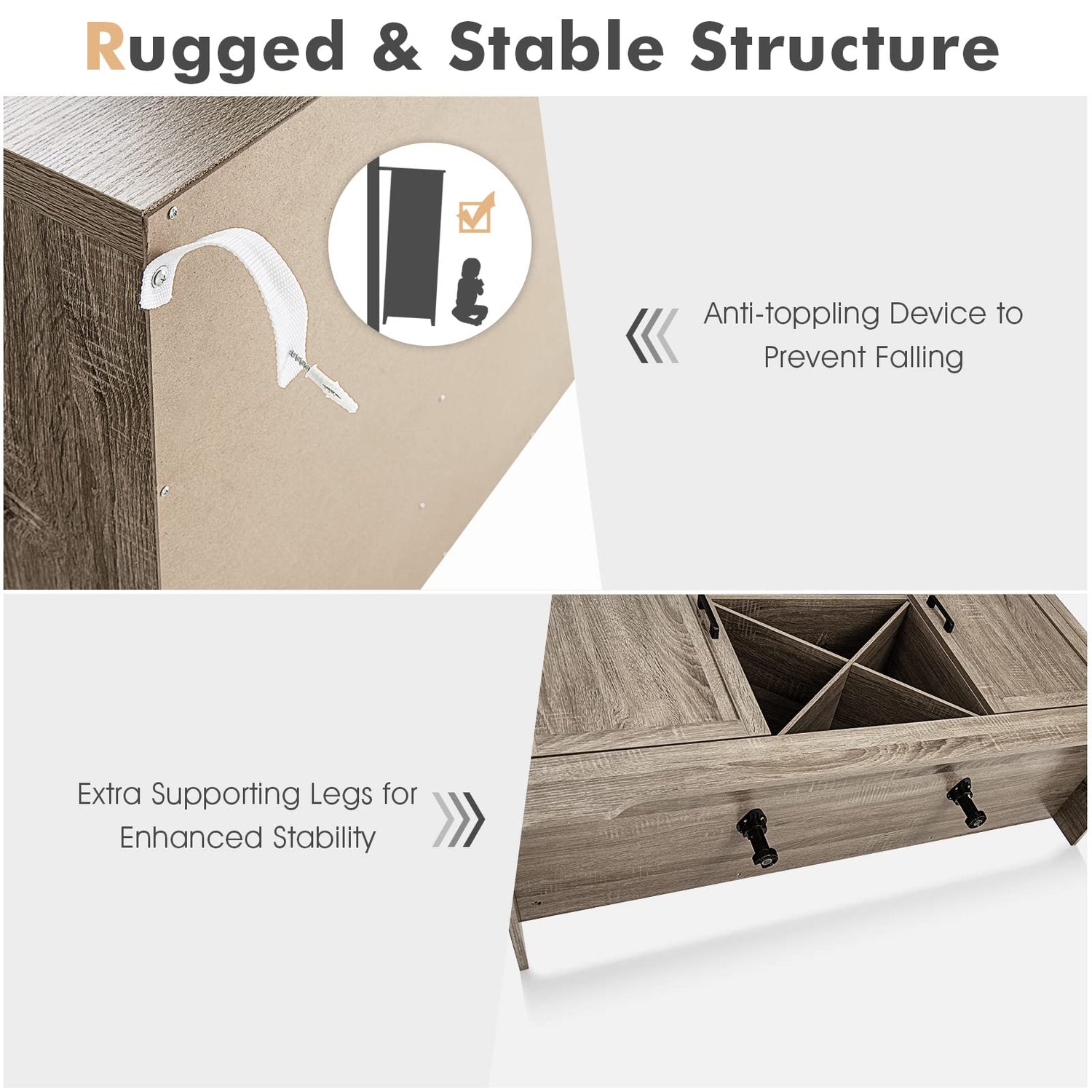 - 〖Sturdy Structure & Safety Design〗: Constructed of premium engineered wood and MDF, this wine cabinet features long-lasting performance and great sturdiness. 2 extra support legs on the bottom also improve overall stability. Considering safety use, the wine cabinet is equipped with anti-toppling device to avoid wobbling.