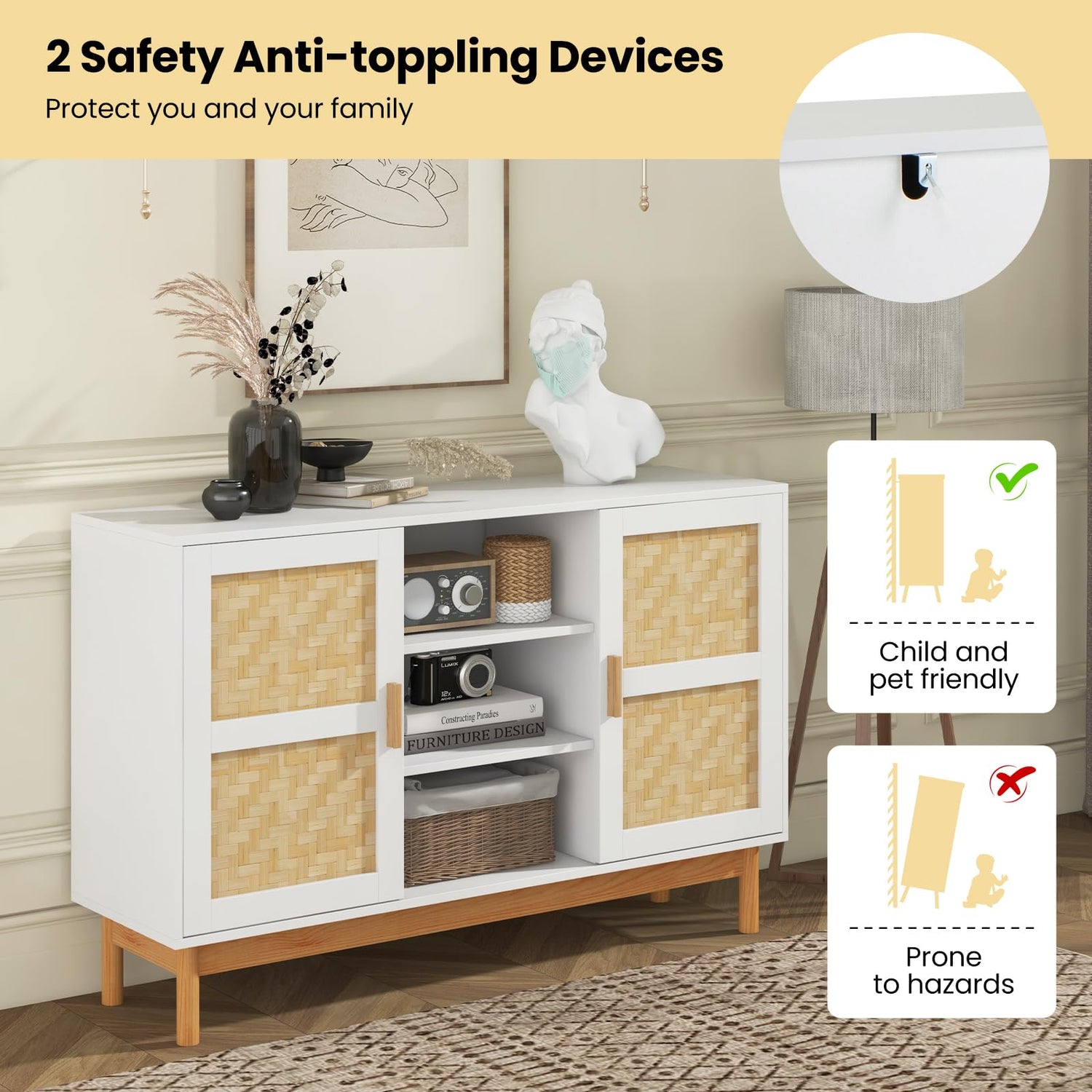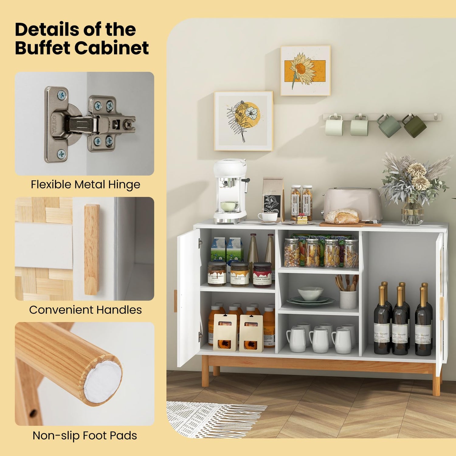 Giantex Buffet Sideboard, Kitchen Storage Cabinet with 3 Open Shelves & 2 Side Cabinets, 48” Wood Cupboard w/ 2 Bamboo Woven Doors, Console Table for Living Room Entryway Coffee Bar, Natural