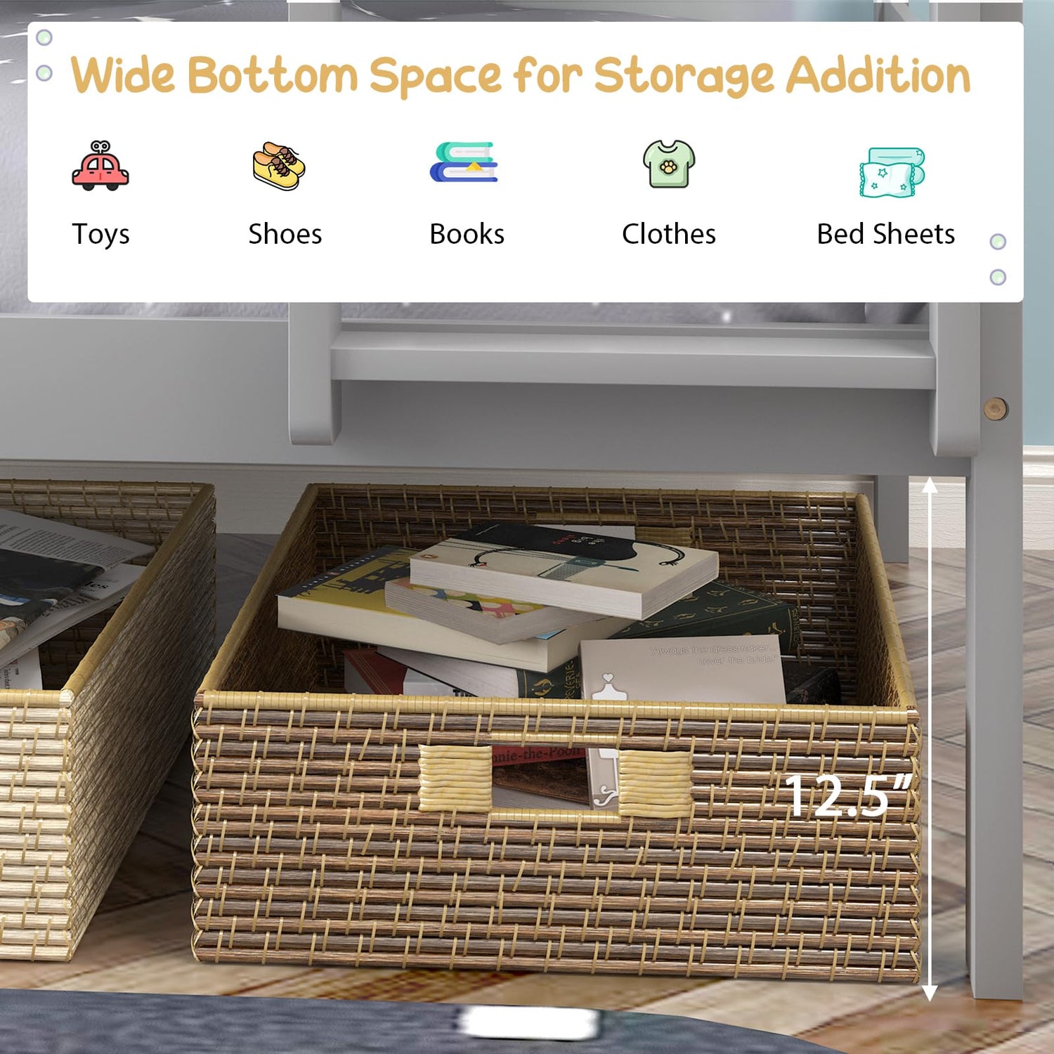 Not only is this bunk bed a stylish addition to your home, but its elevated design serves as a clever storage solution. The space underneath is perfect for stowing away boxes, clothes, toys, and other essentials, helping to maintain a tidy and organised bedroom. With a generous 12.5-inch vertical clearance, cleaning is a breeze, allowing you to easily vacuum or sweep underneath.