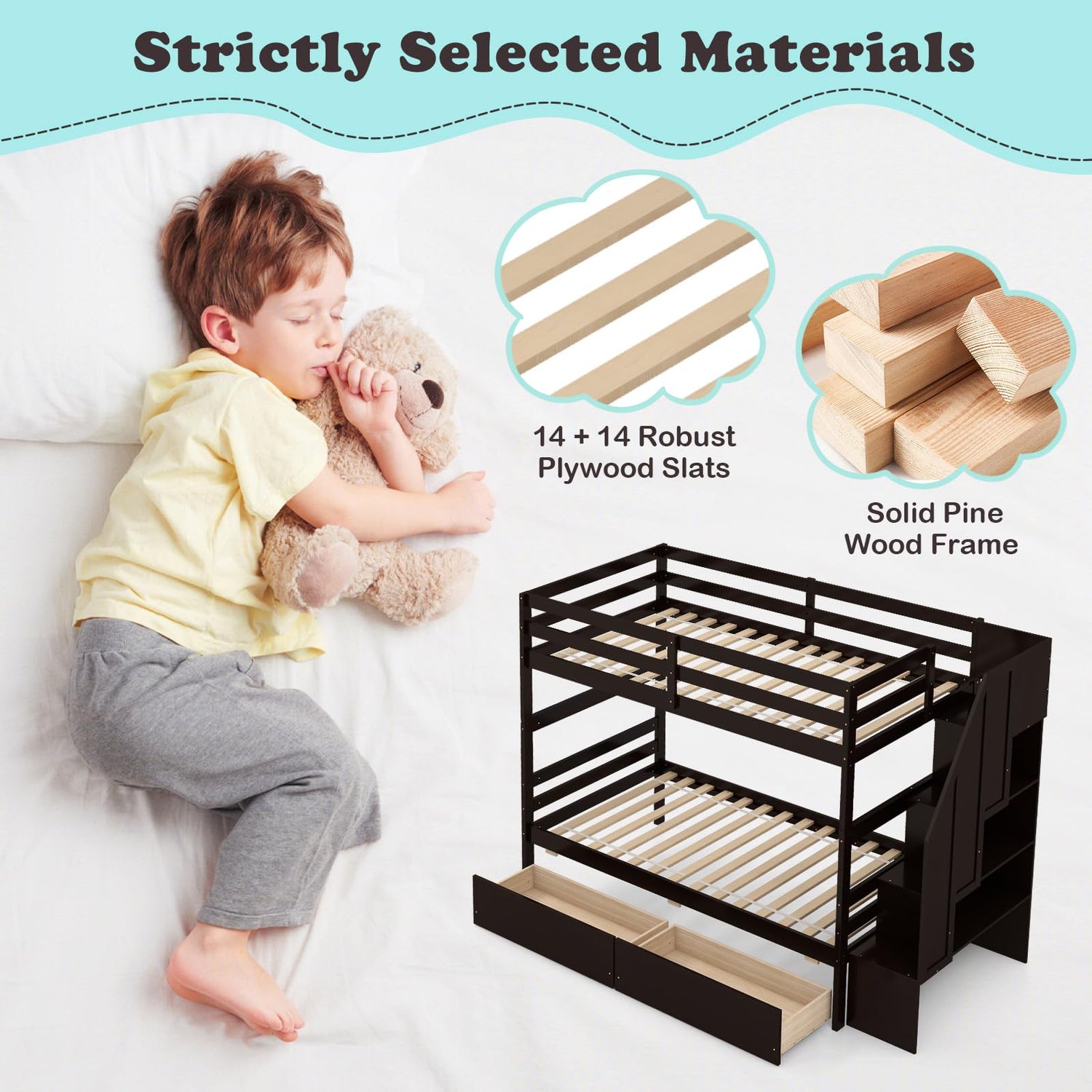 Giantex Bunk Bed Twin Over Twin with Storage Stairs & Drawers, Solid Wood Bunk Bed with Full-Length Guardrails, Convertible to 2 Beds, Versatile Bunk Beds for Kids Teens Adults, Espresso