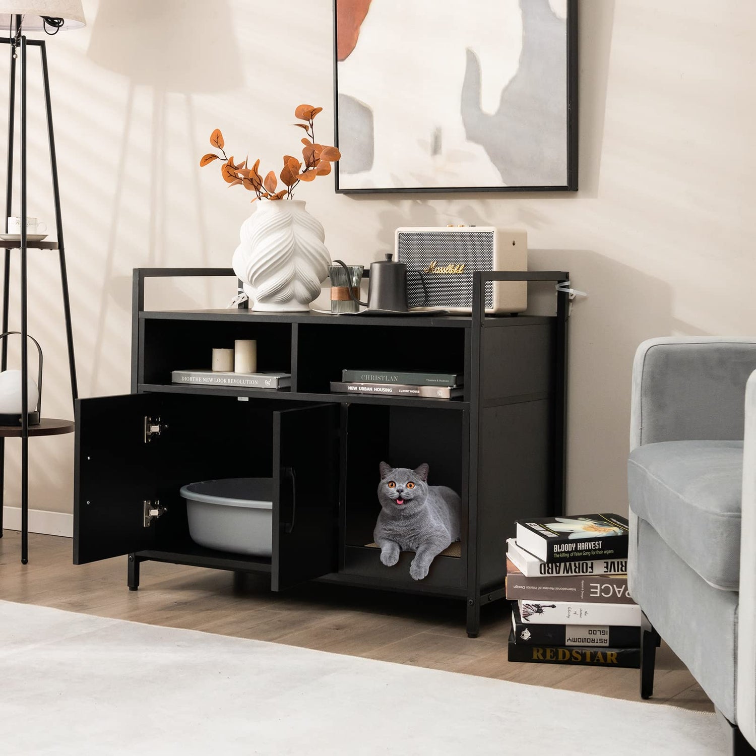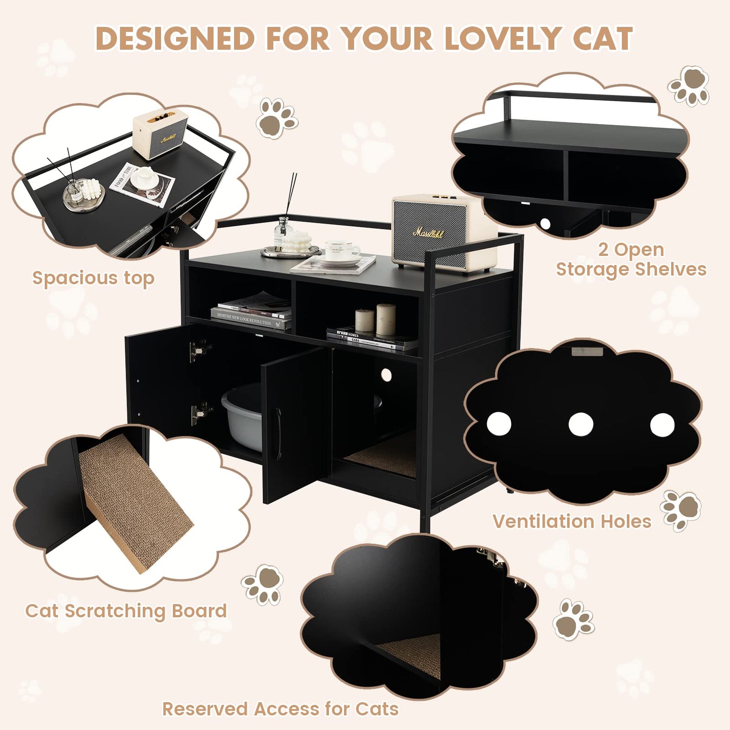 Giantex Cat Litter Box Enclosure - Cat Washroom Hidden Furniture with Front Entry, Cat Scratcher, 2-Door Storage Cabinet, 2 Compartments, Air Vents, Metal Frame, Wooden Pet Crate House (Black)