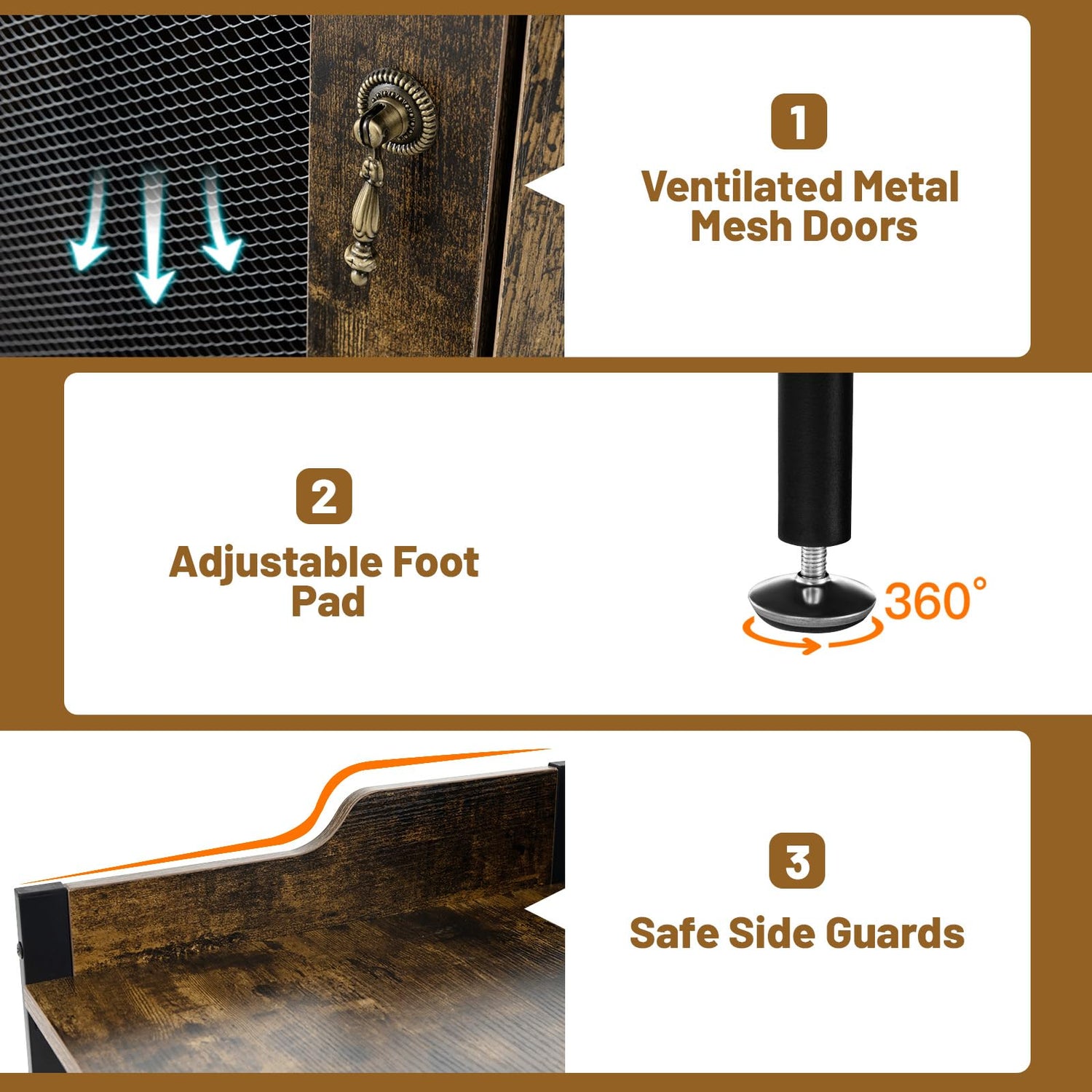 - Vintage Appearance: The combination of board, matte black frame and metal mesh doors adds a retro and elegant appeal to the liquor cabinet, making it blend into various furnishing styles, such as modern, farmhouse, industrial, etc.