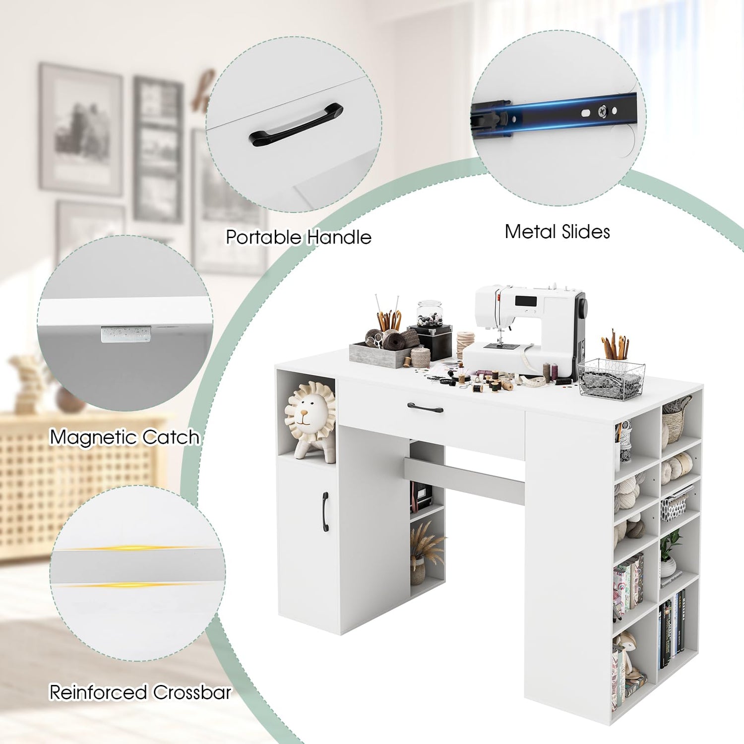 - 【Ample Storage Space】: This craft station features a variety of storage options, including a cabinet with 2 shelves, large drawer, and 14 cube storage shelves for organizing sewing tools and supplies.