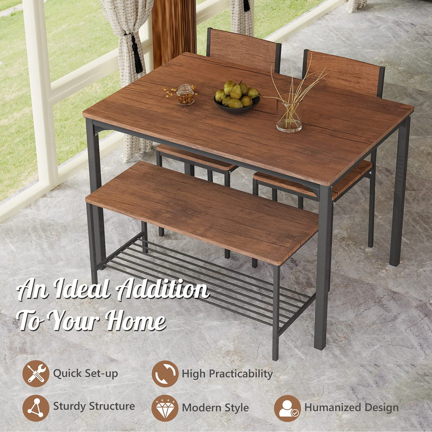 Giantex Dining Table Set for 4, 43" Kitchen Table and Chairs, Dining Bench with Metal Frame & Storage Rack, 4-Piece Modern Functional Desk Set for Dinette, Small Space, Apartment, Restaurant, Brown