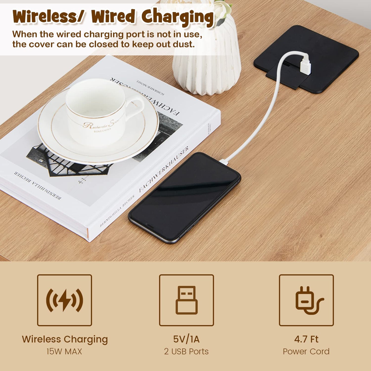 - 【Wireless and Wired Charging Support】: This end table has a built-in charging station with 2 USB ports and a wireless charging area for easy phone charging. The tabletop has a cover that can hide the USB ports, keeping them out of sight. When not in use, the cover can be closed to prevent dust accumulation.