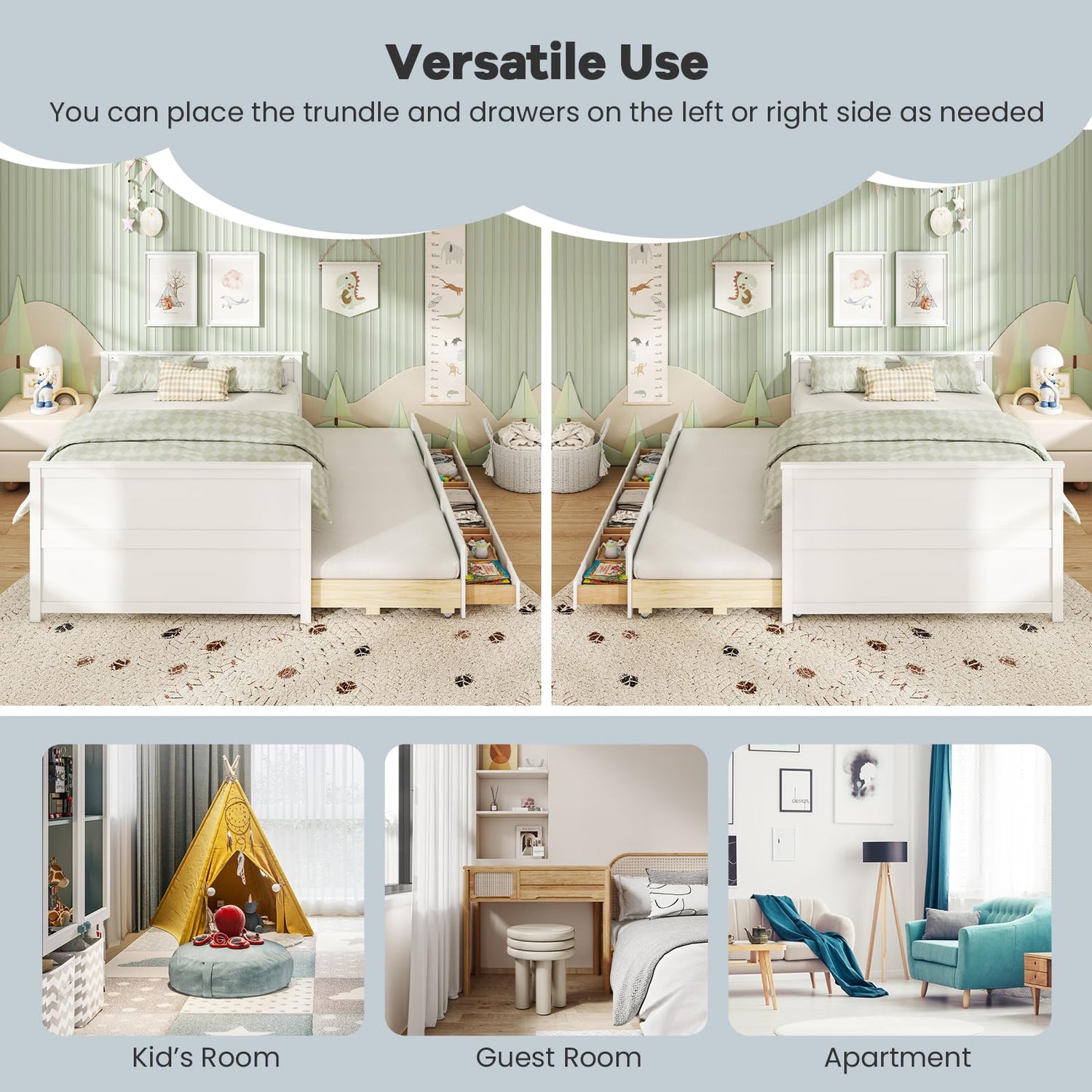 Giantex Full Size Bed Frame with Twin Trundle & 3 Storage Drawers, Modern Platform Bed with Headboard & Footboard, Wooden Slats Support Captain Bed for Teens Adults, No Box Spring Needed, White