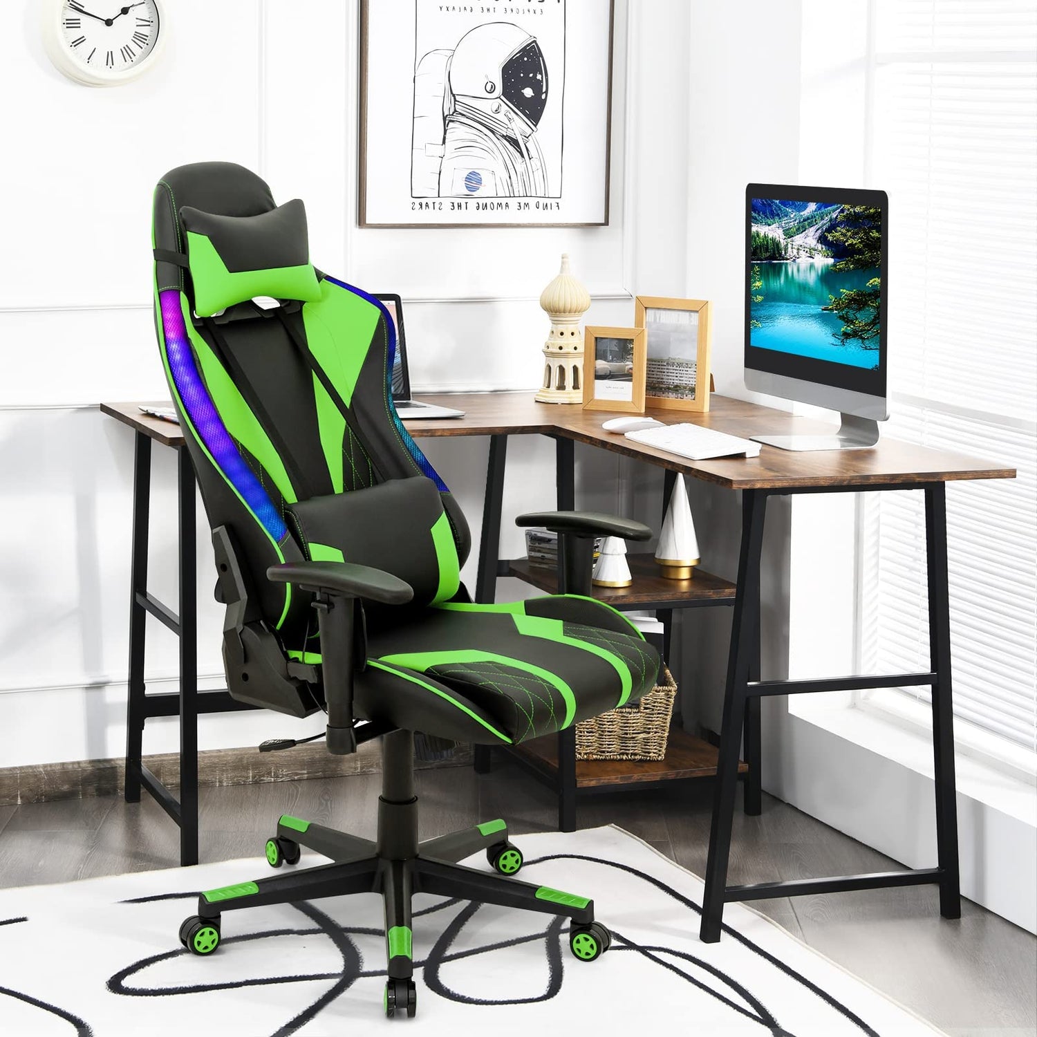 Giantex Gaming Chair with RGB LED Lights, Ergonomic Video Game Chair, High Back PVC Leather E-Sport Computer Chair Adjustable w/Headrest & Lumbar Support (Green)