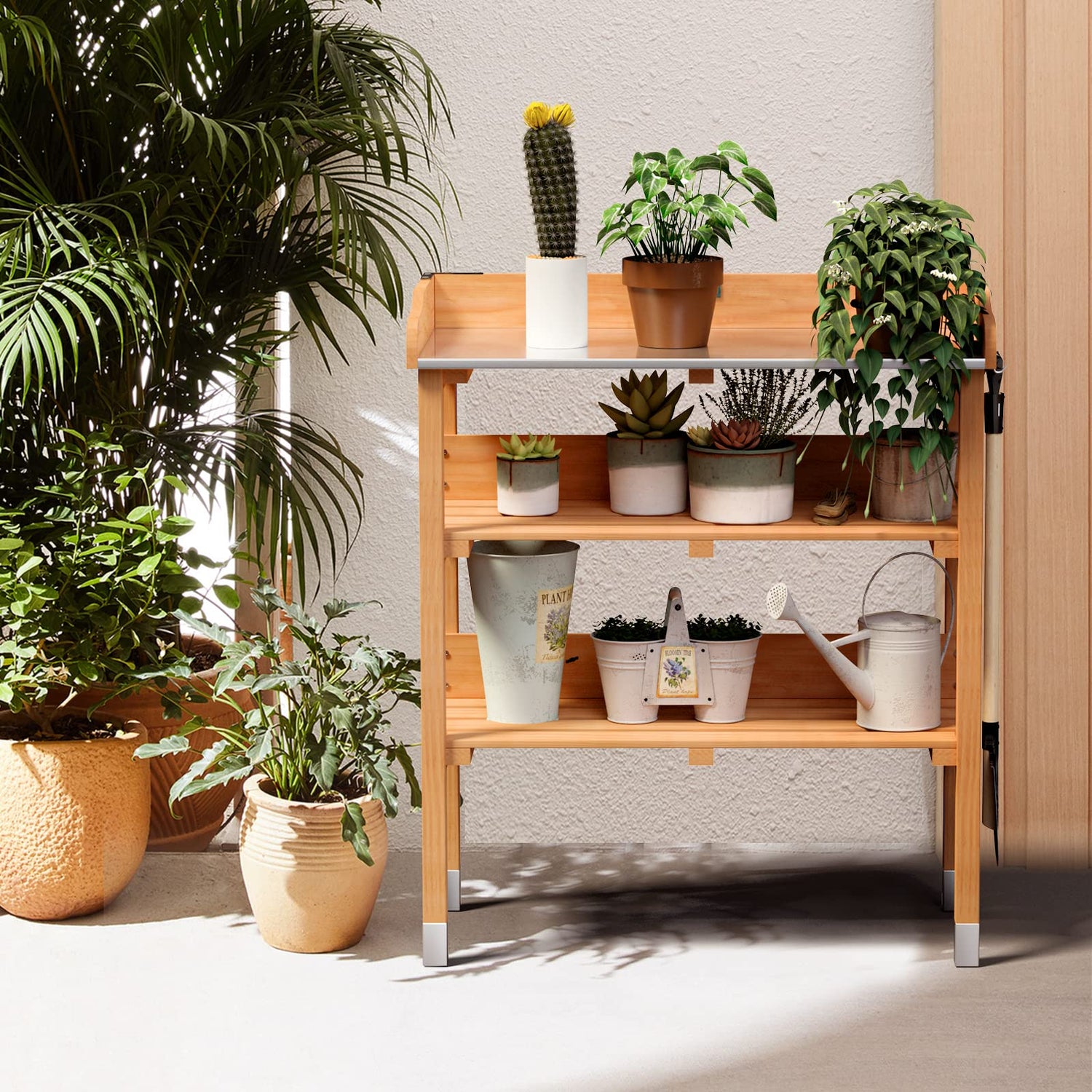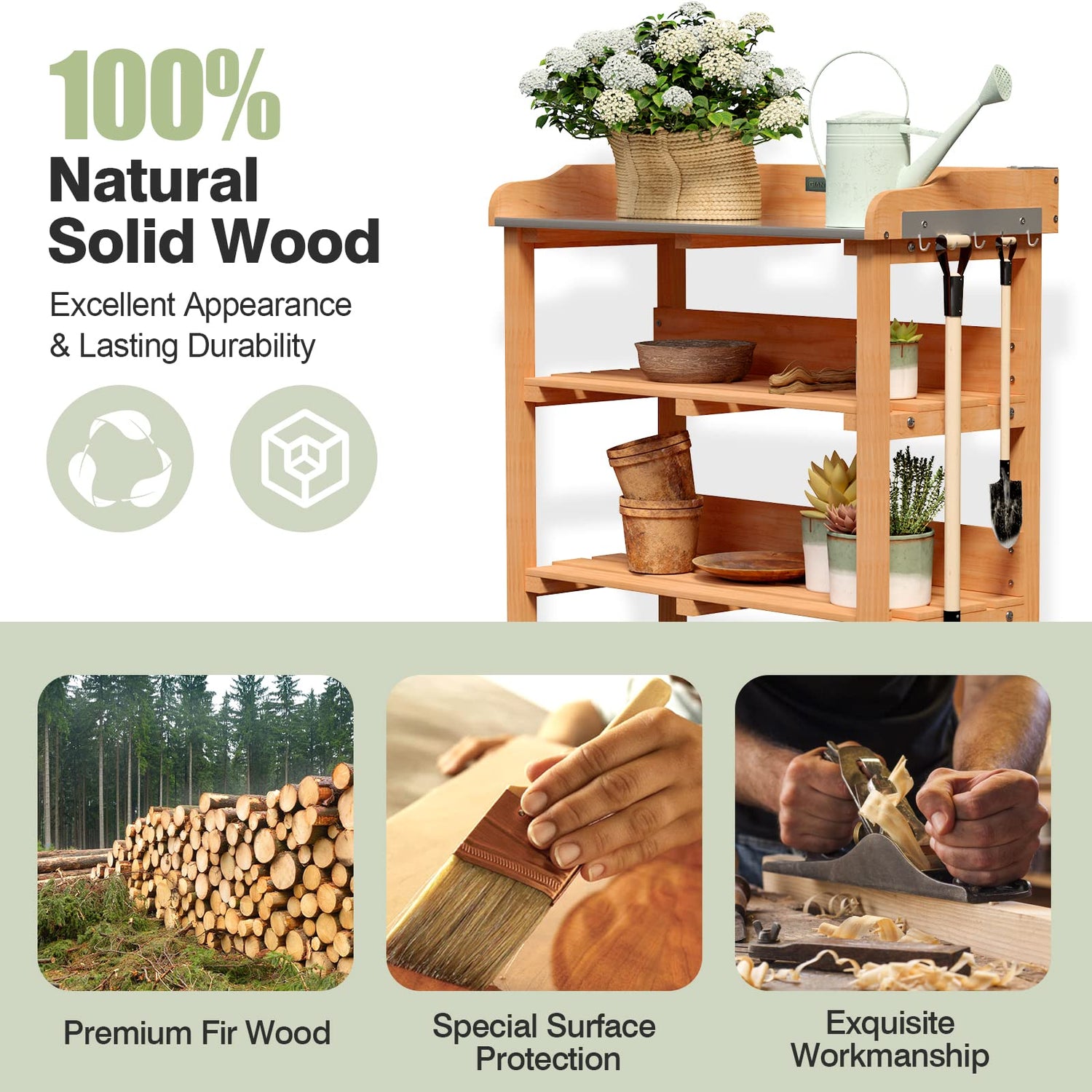 Giantex Garden Potting Bench, Outdoor Wood Workstation Table with Galvanized Steel Tabletop, 5 Hooks, 2-Tier Storage Shelves, Outside Work Station Potting Table with Raised Edge, Easy Assembly