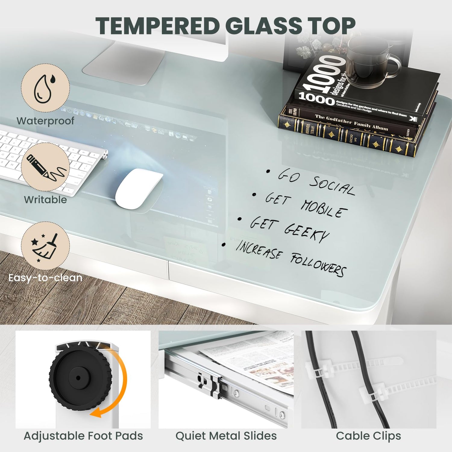 - [Tempered Glass Top with Drawer]: The tempered glass top is not only waterproof and easy-to-clean but also writable, perfect for jotting down quick notes. Integrated with quiet metal slides, the drawer offers convenient storage for books, stationery, and office supplies, maintaining a clutter-free area.