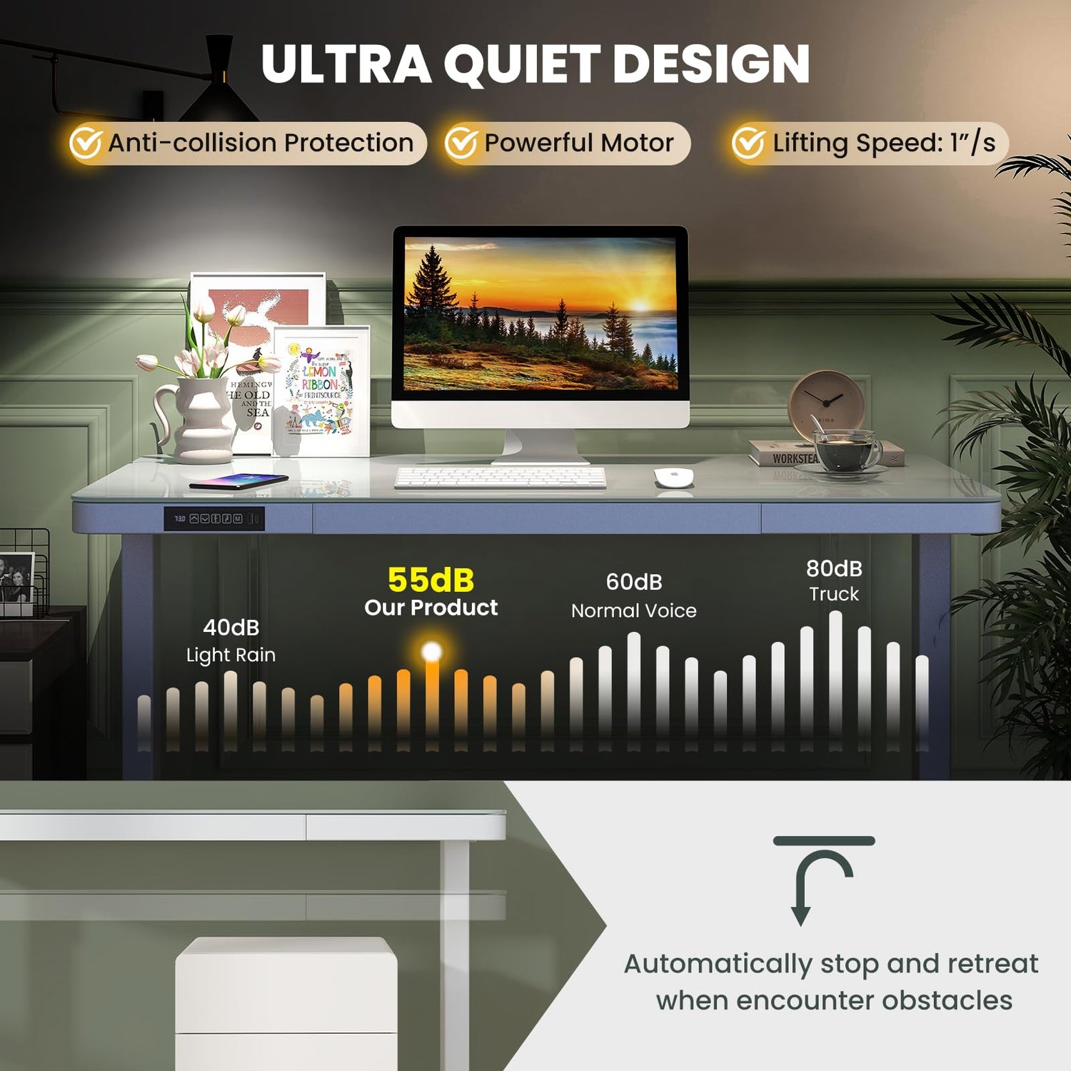 Elevate your workspace with the sophisticated and versatile glass standing desk with drawers. This electric standing desk blends functionality and style with its height-adjustable feature, ranging from 28.5” to 46.5”. Powered by an efficient motor, it operates at a speed of 1”/s, keeping low noise levels to maintain a focused environment. The tempered glass surface is not only waterproof and easy to clean but is also designed for writing convenience. Below the sleek top, a smoothly integrated drawer slides quietly on metal rails, providing adequate storage. Control is at your fingertips with the multi-function intelligent keypad. The inclusion of USB & Type-C ports ensures your gadgets stay powered, enhancing productivity without leaving your desk. The desk features anti-collision technology for safety, halting, and retracting upon sensing any obstacles. Transform and optimize your work area with this practical, space-efficient standing desk, suitable for any room.