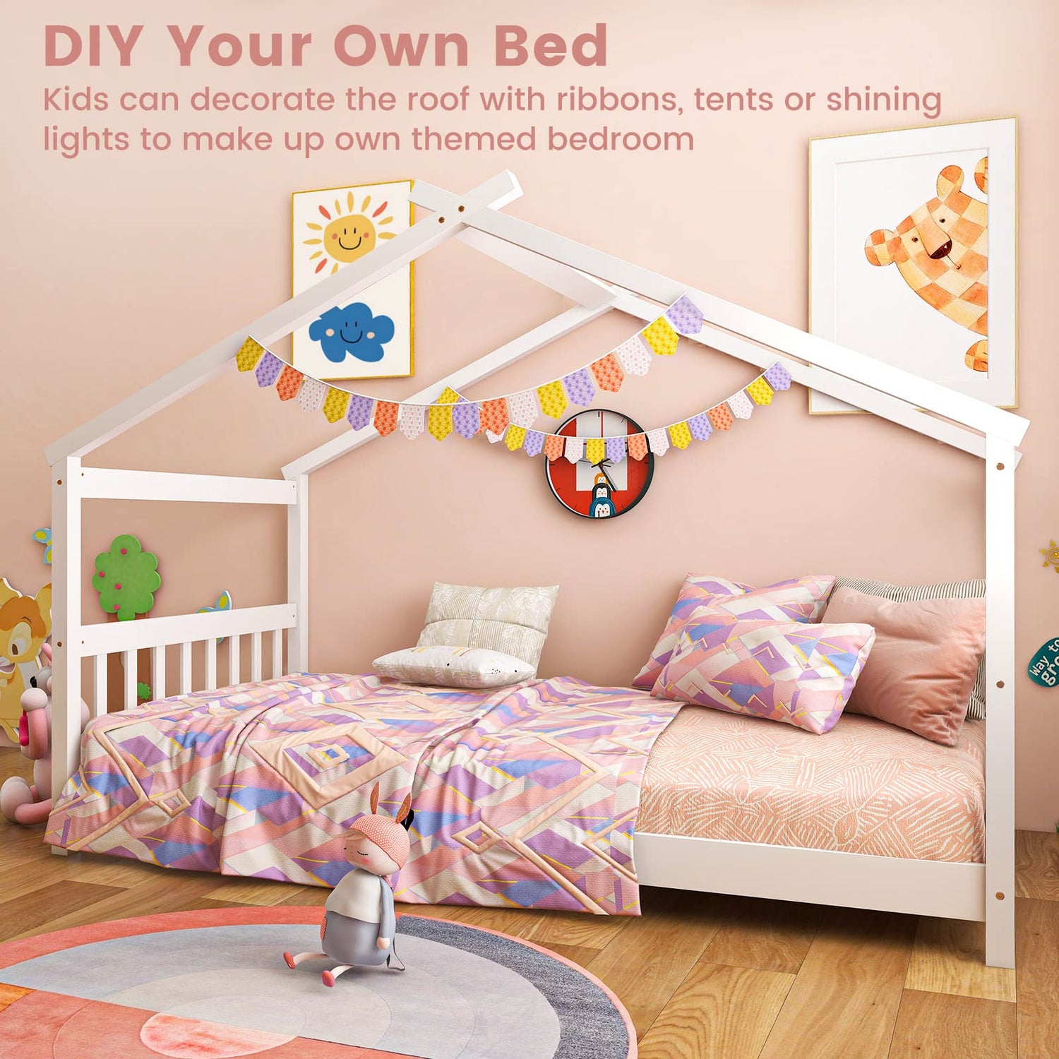 Transform your child's bedroom into a whimsical retreat with the Giantex Twin House Bed in Solid Wood. This creative and charming bed features a unique house-shaped design that encourages kids to unleash their imagination. They can personalise the roof with decorations like ribbons, tents, or fairy lights, turning their sleeping space into a themed sanctuary that sparks countless adventures.