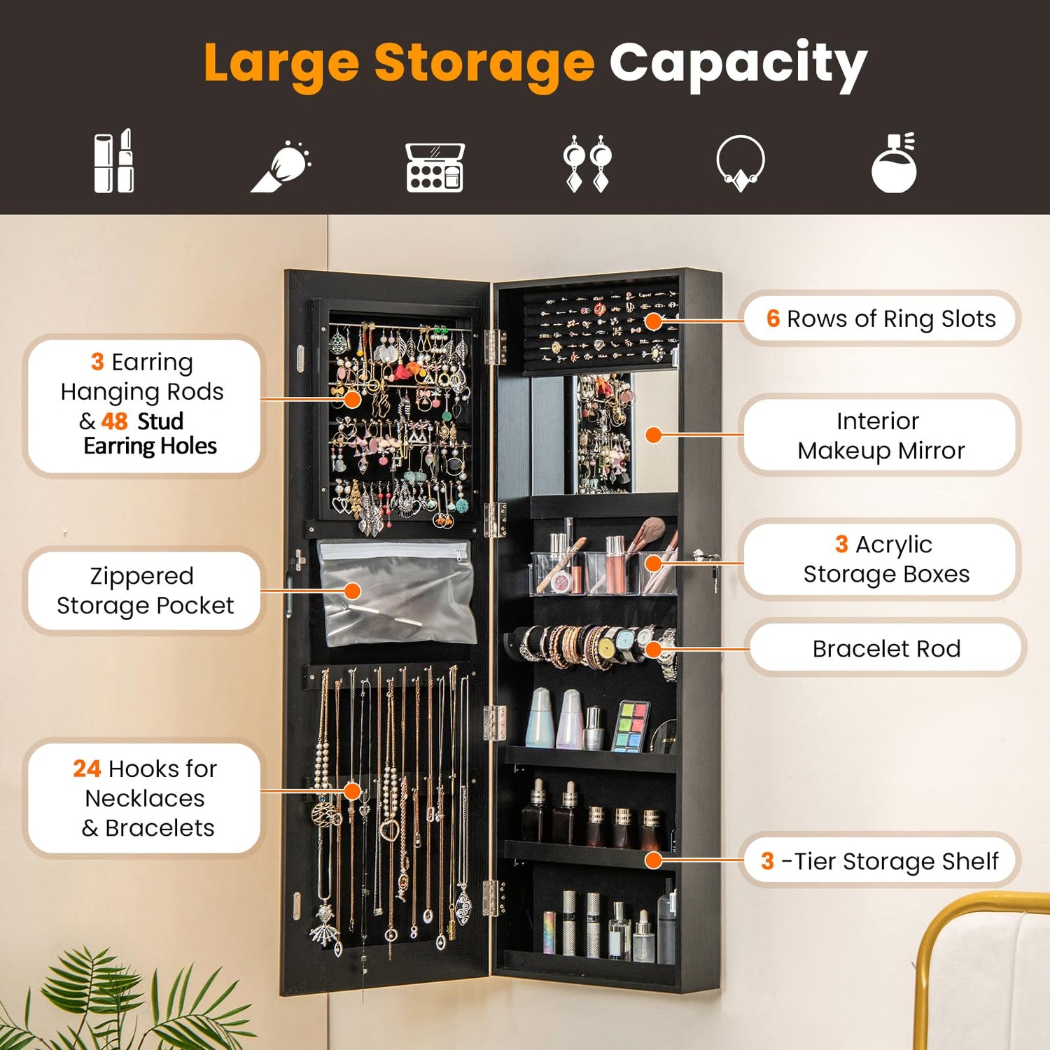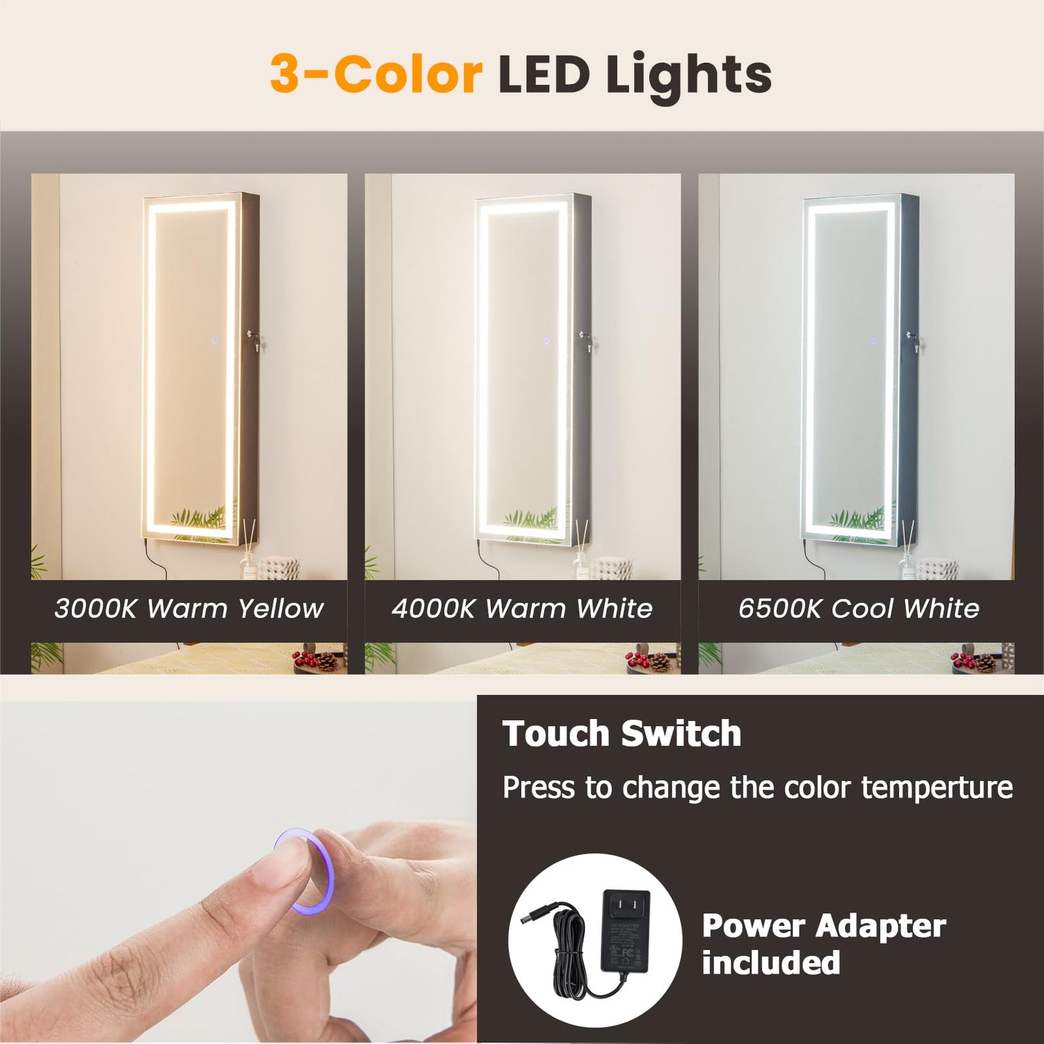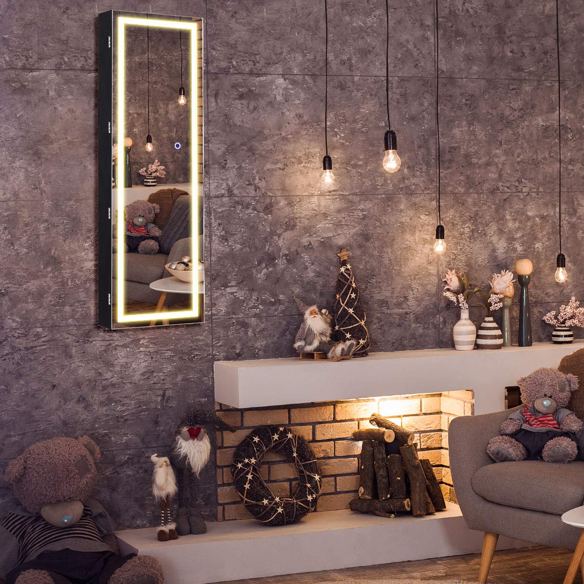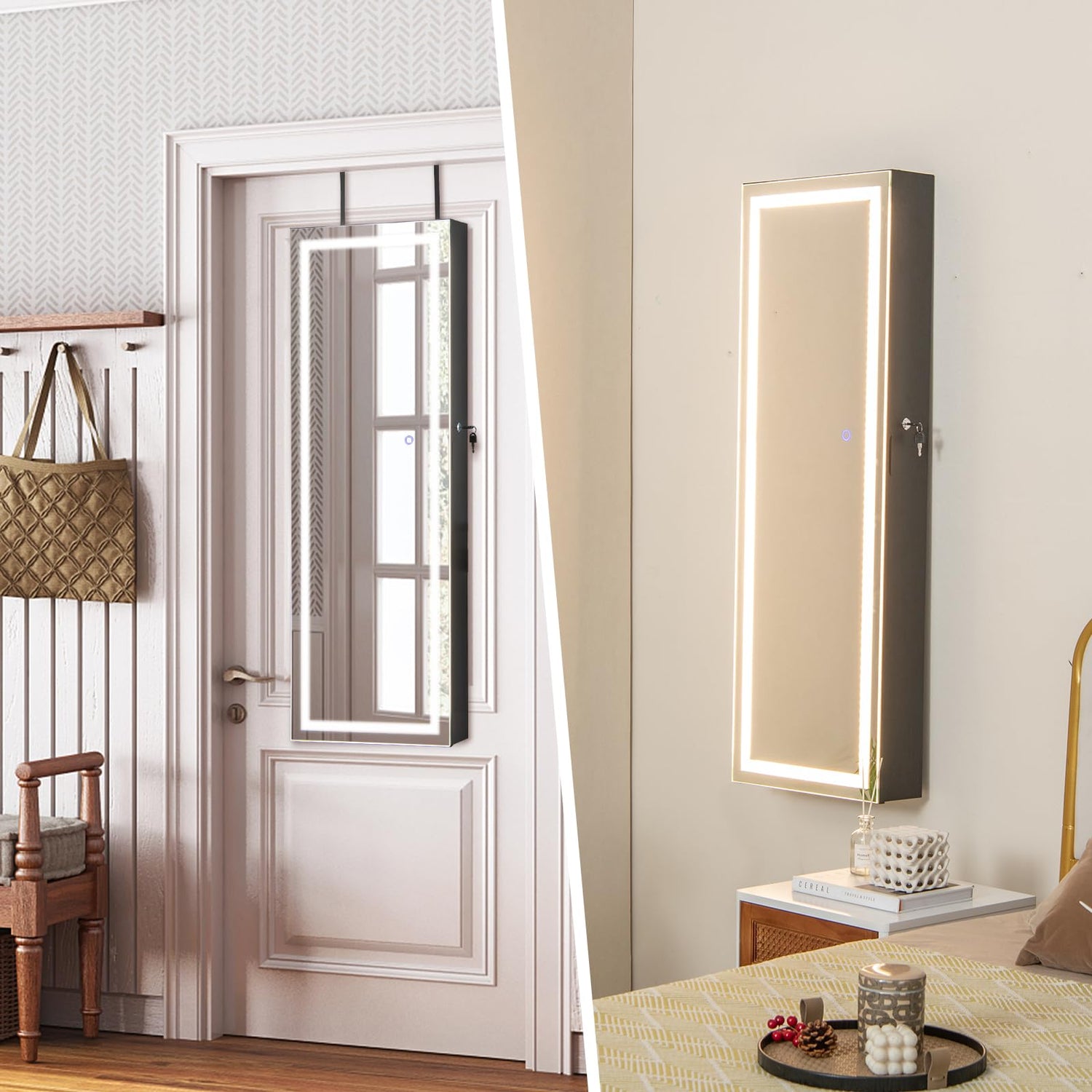 Giantex Jewelry Cabinet Armoire Door Wall Mount, 47.2in Lockable Touch Screen Lighted Full Length Mirror, 3 Lighting Settings, Inside Makeup Mirror, Jewelry Storage Box Organizer (Black)
