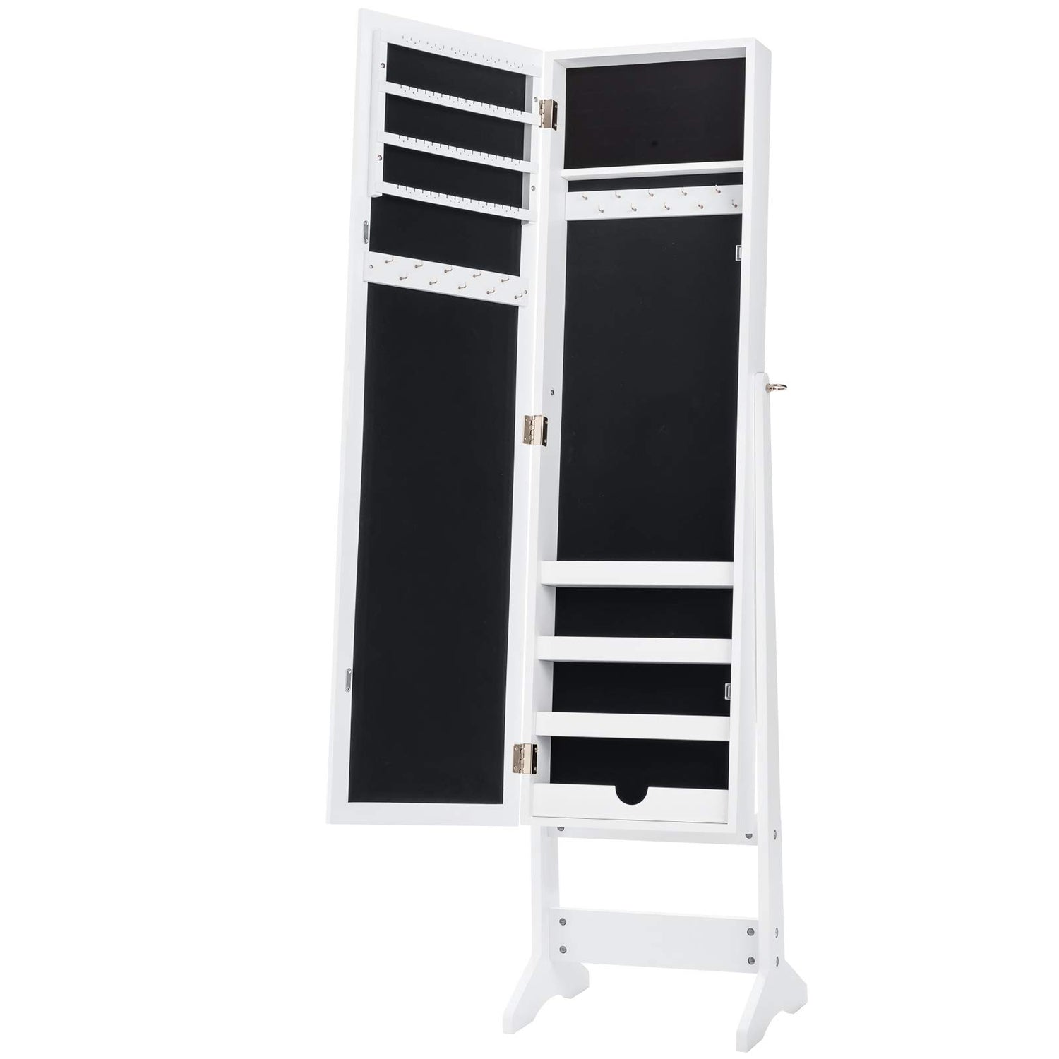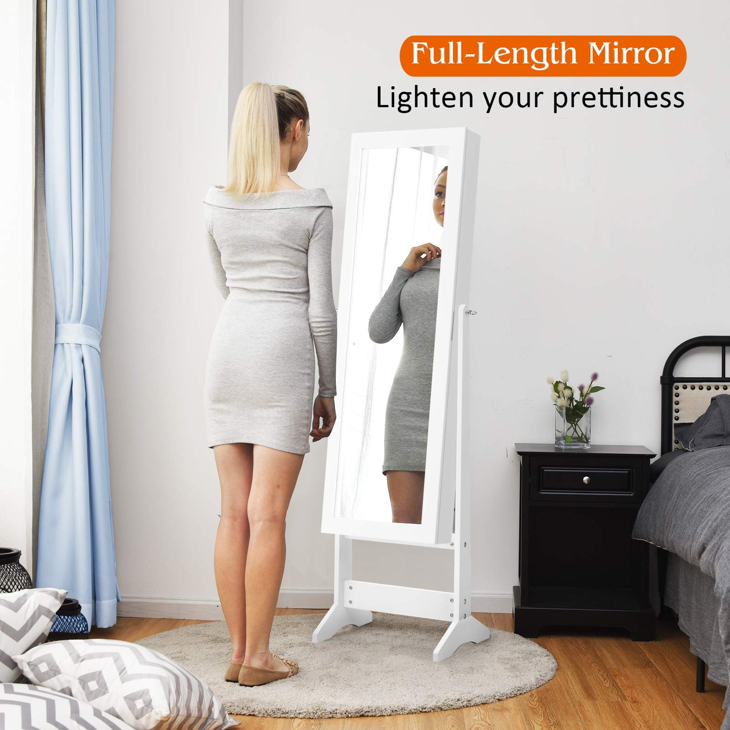 Giantex Jewelry Cabinet with Full-Length Mirror, Standing Jewelry Armoire Organizer with 64 Earring Slots, 20 Necklace Hooks, 72 Ring Slots, 4 Storage Shelves, 3 Angel Adjustable (White)