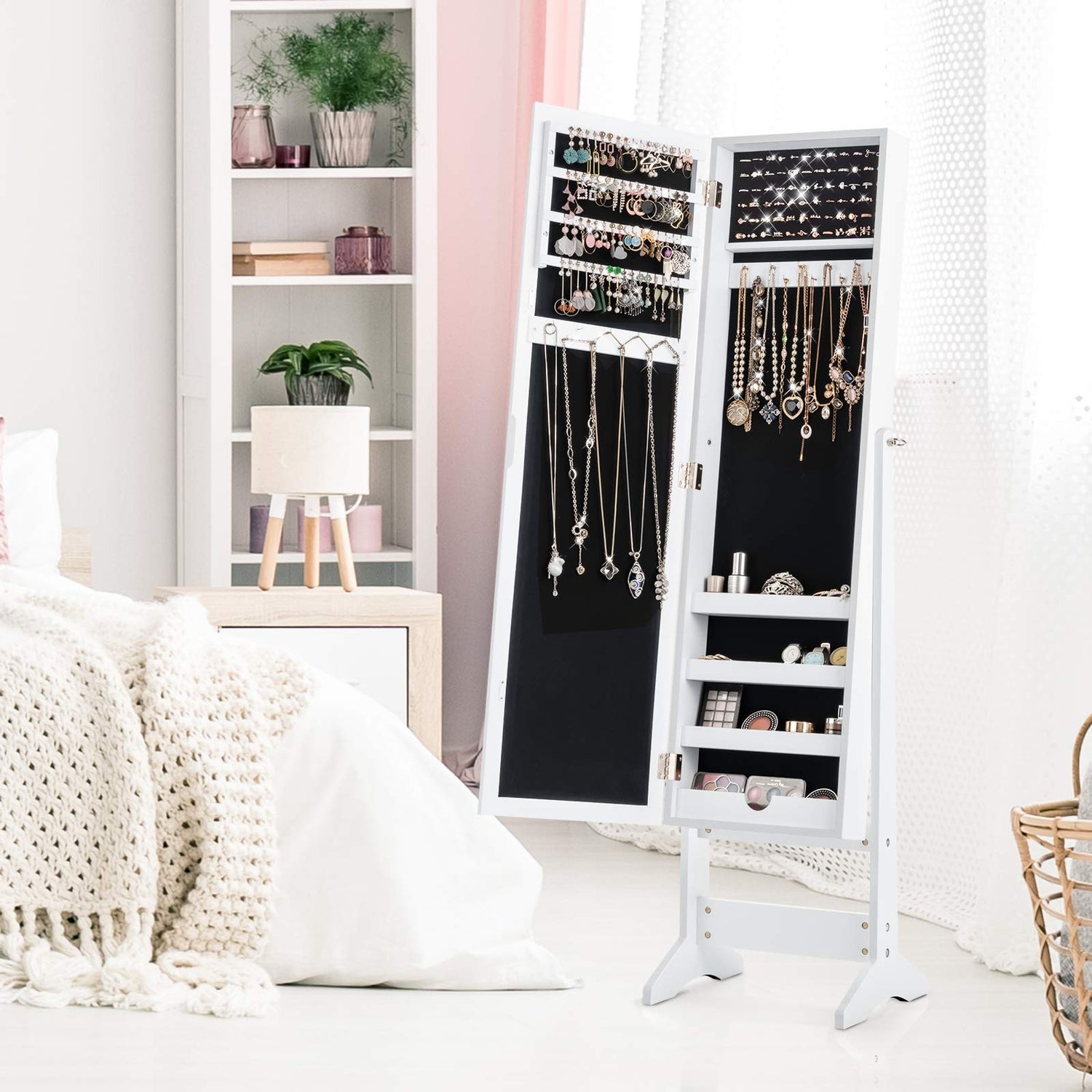 - 【2-in-1 Mirror & Cabinet】: Combined a mirror with a jewelry organizer in one cabinet, this freestanding jewelry armoire allows you to enjoy the dual benefits and endless fun of dressing up. You can use it as a mirror for you to dress or a practical jewelry cabinet to store your value jewelry, leaving you a clean and spacious space.