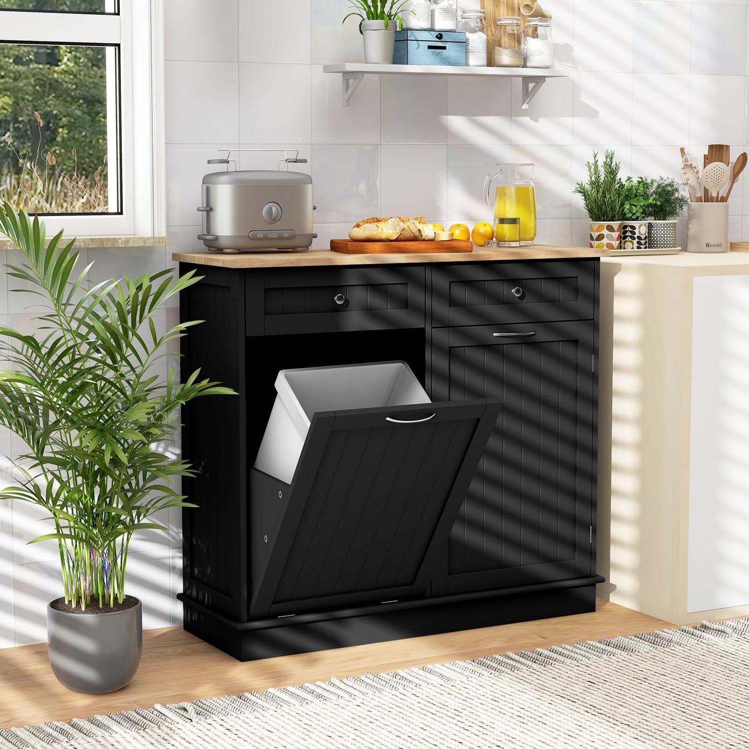 Giantex Kitchen Trash Cabinet, Kitchen Island with Tilt Out 15.5 Gallon Garbage Bin, Rubber Wood Countertop, Large Cabinet, 2 Drawers, Adjustable Shelf, Recycling Can Holder Organizer (Black)