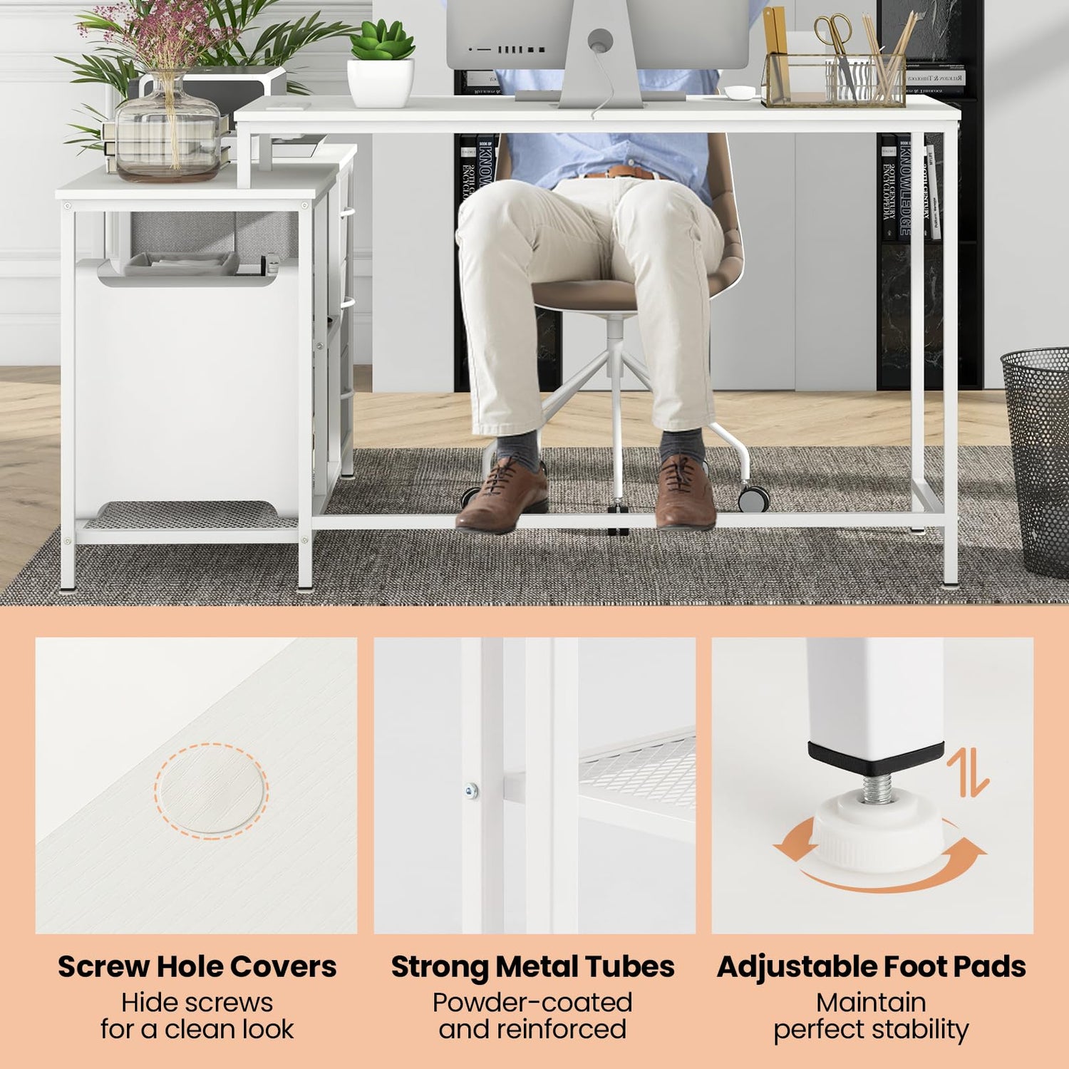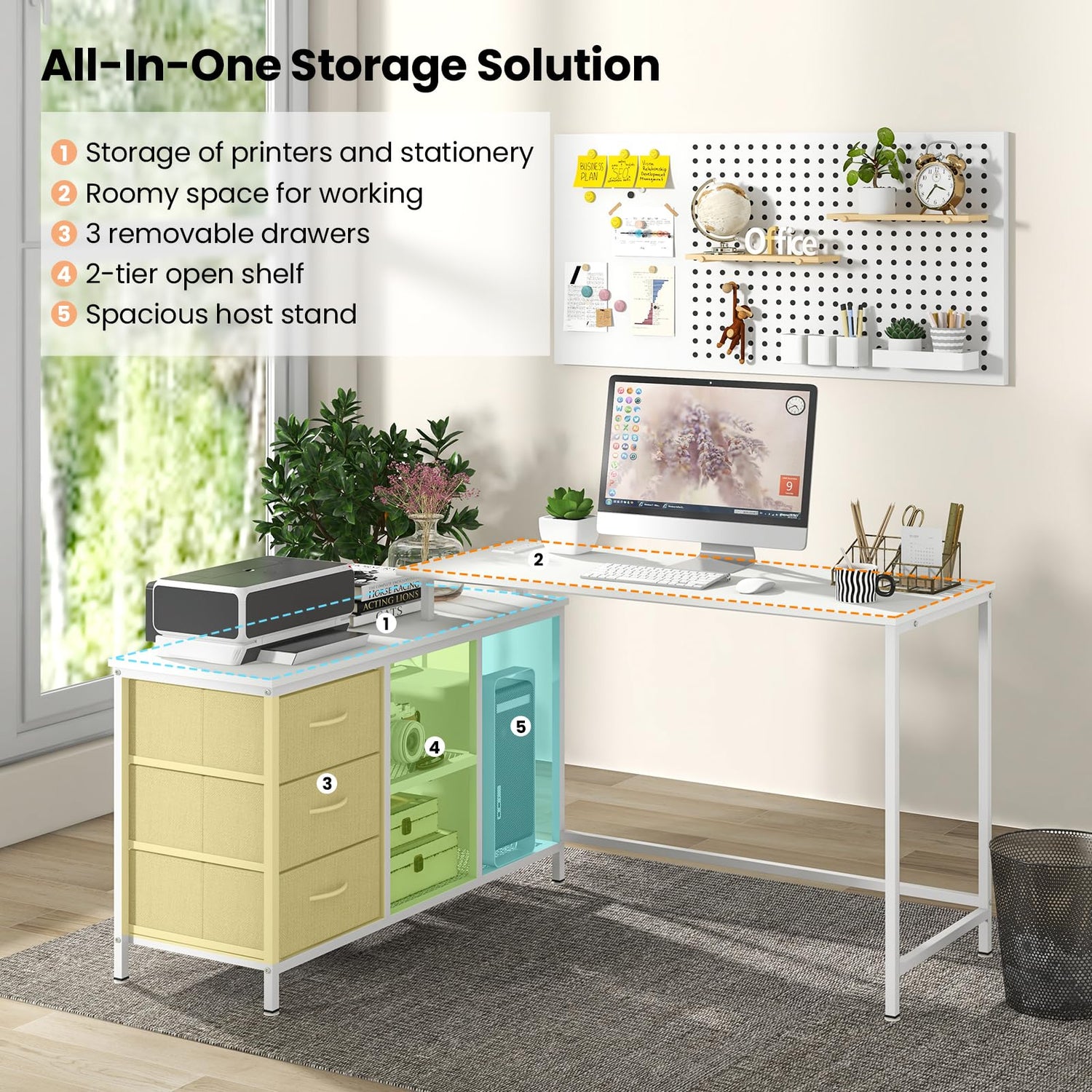 Step into your personal work paradise with the vibrant L-shaped computer desk. Whether you prefer a straight desk or an L-shaped office desk, it has got you covered. Also, with its detachable tall tabletop, you have the freedom to create a smaller study writing desk. It offers roomy space for working and large storage of printers and stationery. With 3 removable drawers, 2 shelves, and a multi-functional host stand, this workstation desk can keep everything within reach. Say goodbye to tangled cords and dead batteries, as this computer desk is equipped with 2 AC outlets and 2 USB ports for convenient charging. Built with a reliable metal frame and adjustable foot pads, it offers unparalleled stability. The L-shaped design allows for efficient multitasking, making it perfect for computer work, writing, reading, or engaging in creative pursuits.