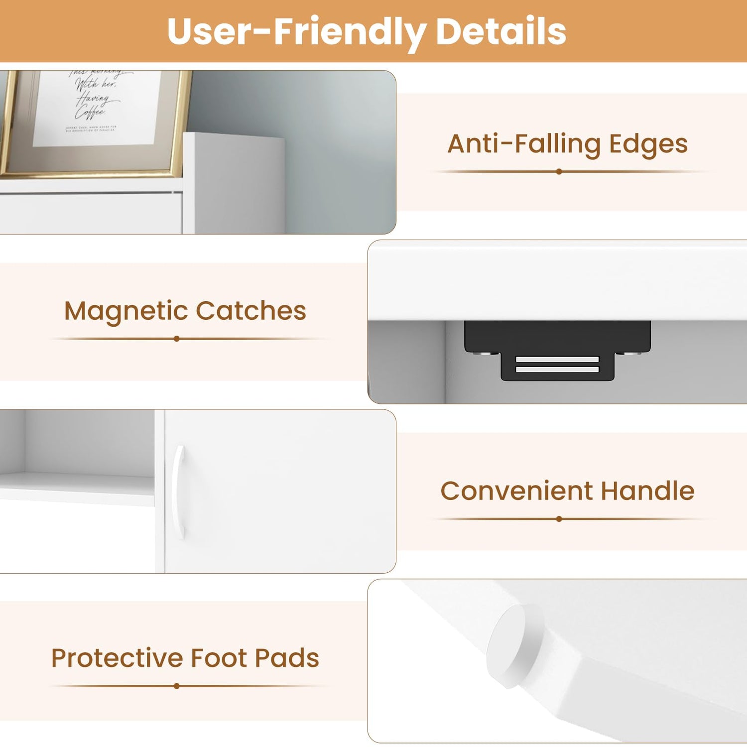 Anti-falling edges of the top shelf keep stored items stay in place