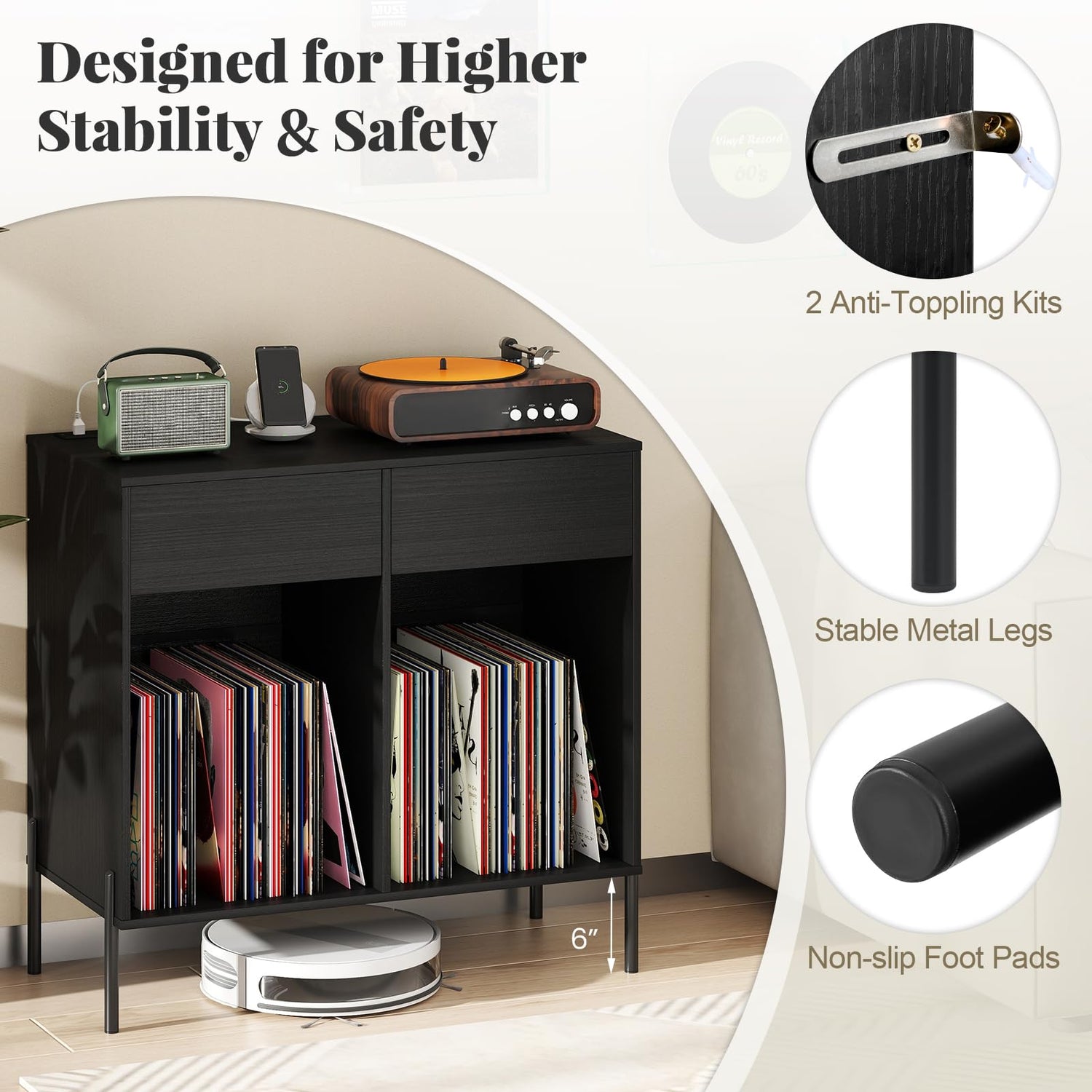 The convenient charging station allows you to charge multiple devices simultaneously. No more struggling with messy wires! There is a cable hole to maintain a neat appearance. In addition to its spacious top, the record player stand is designed with 2 drawers for storing media items. The open compartments feature removable dividers to suit different needs, providing flexible storage solutions for your vinyl records. This turntable display shelf includes 2 anti-toppling kits, ensuring a safe setup in your home. Together with metal support legs, higher stability is ensured. It is an ideal choice for music enthusiasts looking to create a dedicated space for their vinyl collection.