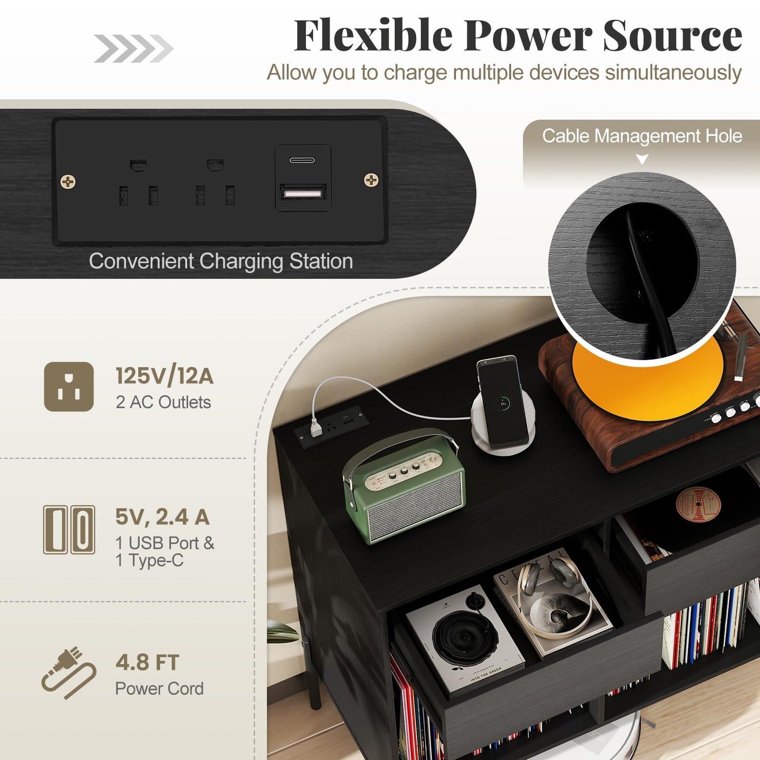Giantex Large Record Player Stand with Charging Station, Mid Century Wood Turntable Stand with 2 Storage Drawers & Compartments, Vinyl Record Storage for Living Room (Black)