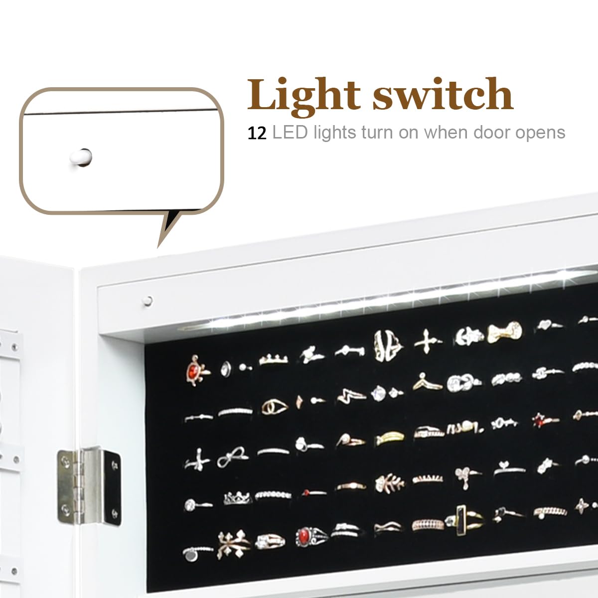 This jewelry cabinet with full size mirror and Led lights is an attractive artwork that is specially designed for all your valuables, helps your jewelry in an organized manner and prevents them fromgetting tangled, and keeps your jewelry safe and away from kids. The LED lightsadd luxury and glory for the cabinet. Full size mirror is convenient for you totry your clothes or jewelry on. In addition, its chic and stylish designfits with your bedroom decor and the wall/door-mounted feature makes itspace saving and pefect for smaller rooms. With it, your life will beconvenient and self-consistent. Worth having!