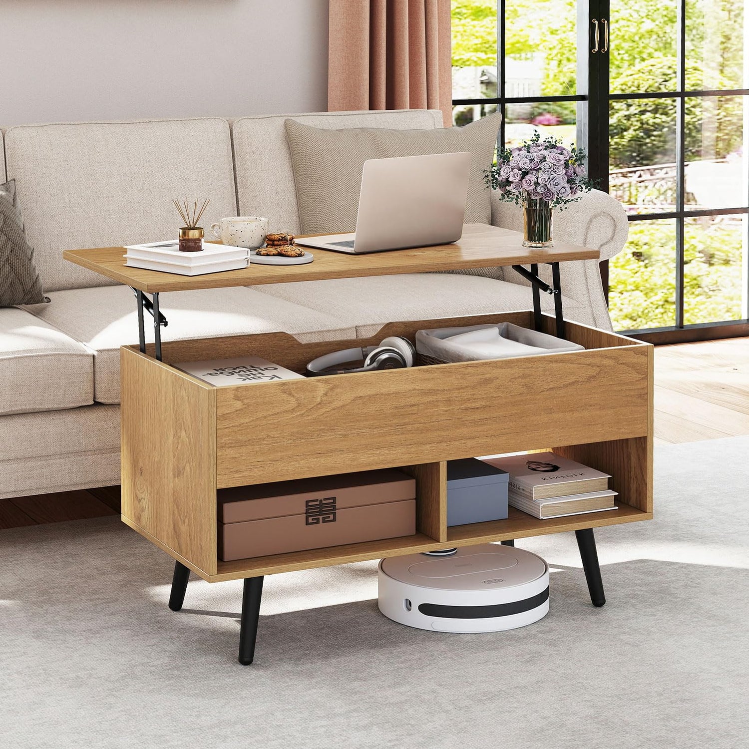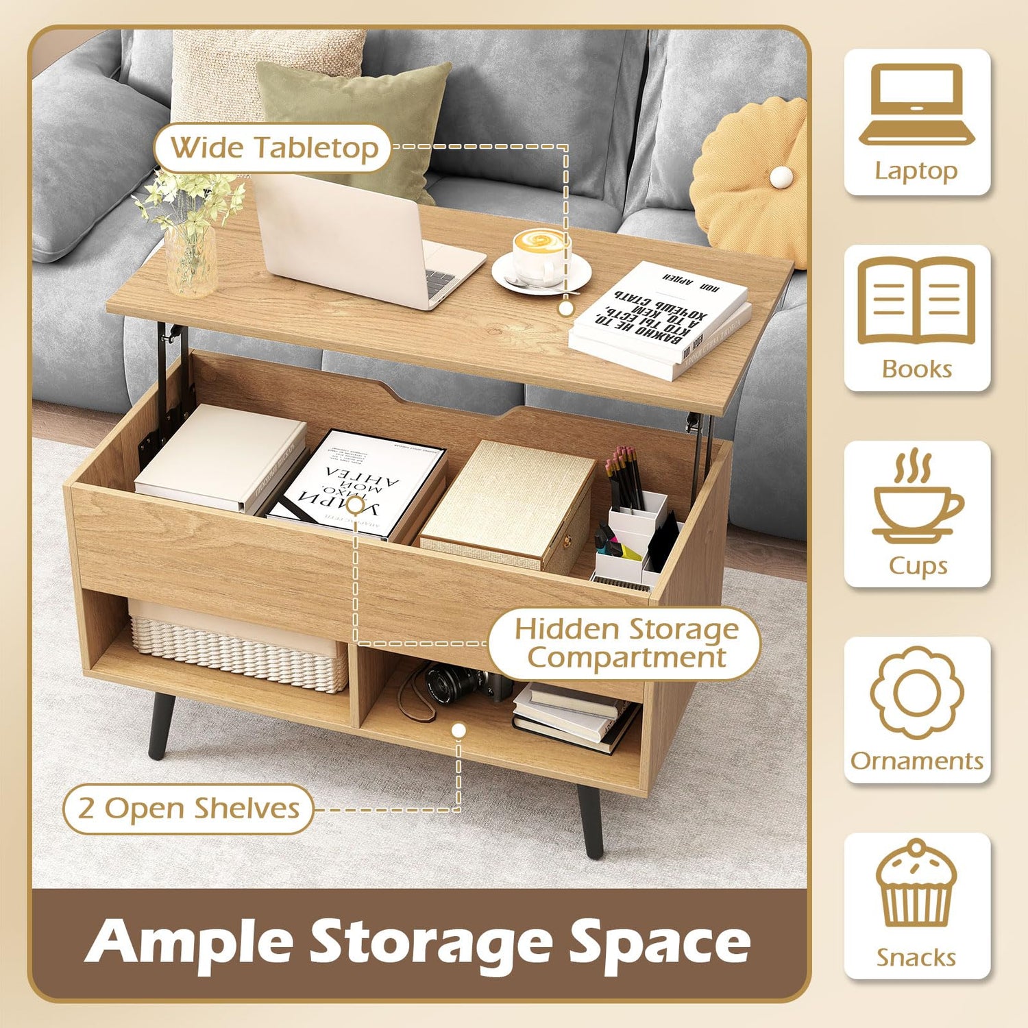 - Diversified Storage Space: Wide tabletop not only facilitates the placement of necessities, but also offers enough space for home office activities. Additionally, the lift top coffee table features a large hidden compartment and 2 open shelves that enlarge storage and display space for daily items.