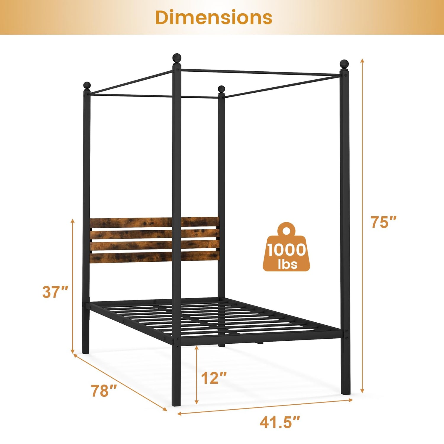 Transform your bedroom into a dreamy oasis with our stunning 4-post canopy bed! Its elegant design boasts decorative ball caps and a charming slatted headboard, exuding rustic charm and warmth. Hang twinkling light strings or exquisite pendant accents to create a cozy sleeping space that feels like a luxury retreat. Crafted with a robust metal frame, this bed provides ultimate durability and prevents sagging, ensuring a lifetime of comfort. Protect your hardwood floors with the anti-scratch foot pads on its sturdy legs. Plus, you'll love the convenient 12 inches of under-bed storage space, perfect for stashing away bedding, suitcases, and more. Assembling is a breeze, and no box spring is needed. Welcome to bedtime bliss!