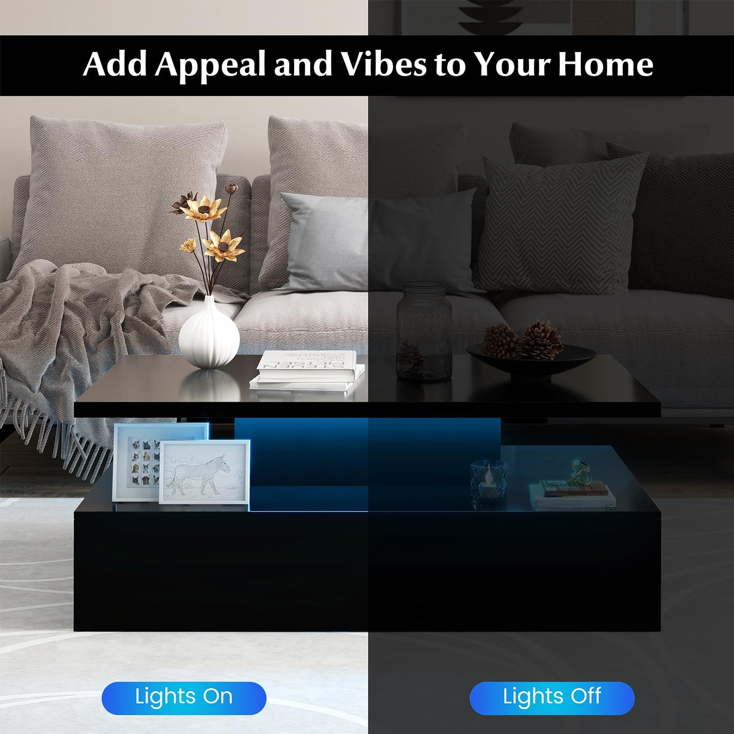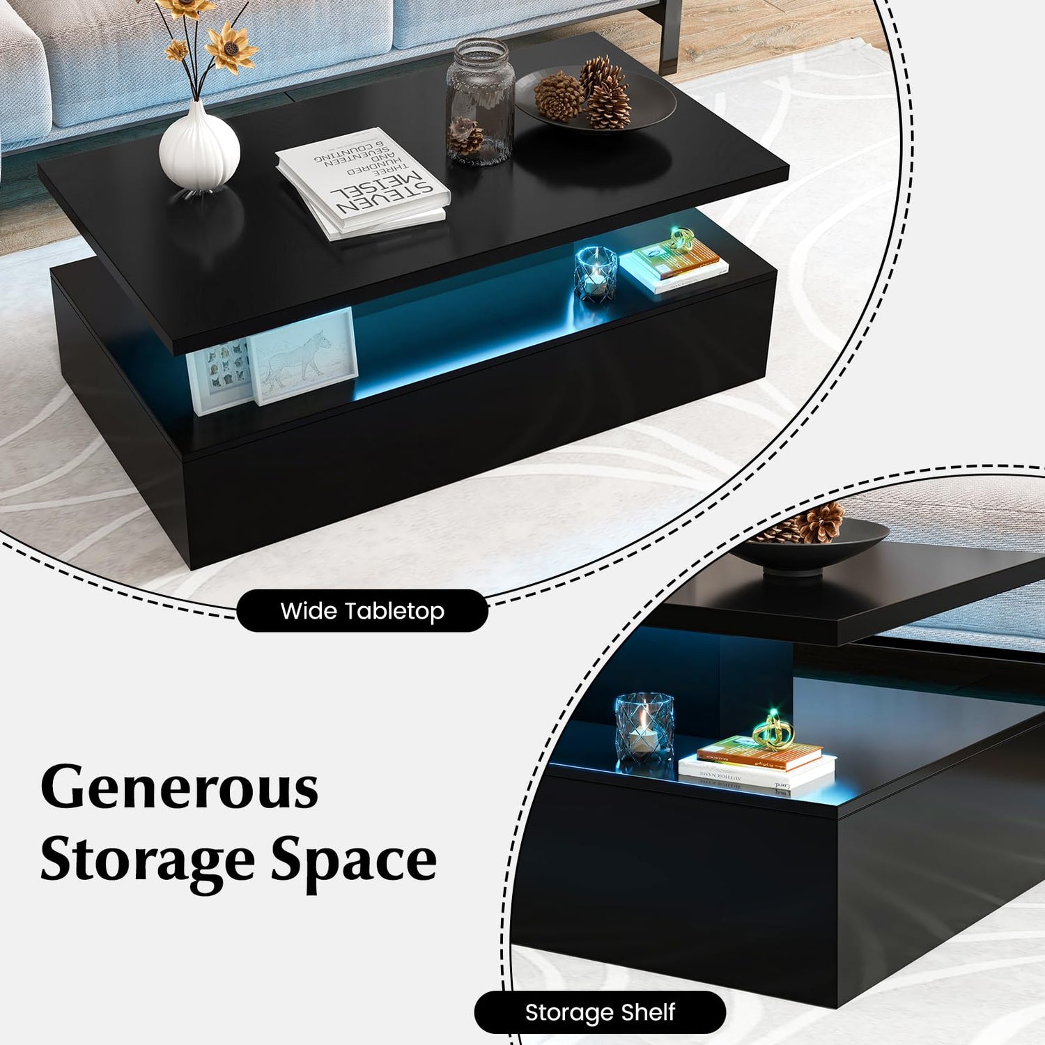 Giantex Modern LED Coffee Table - 2-Tier High Gloss Table w/Adjustable 20-Color Light, 8-Level Brightness & Speed, Remote Control, Contemporary 43.5”L Rectangular Center Table for Living Room (Black)